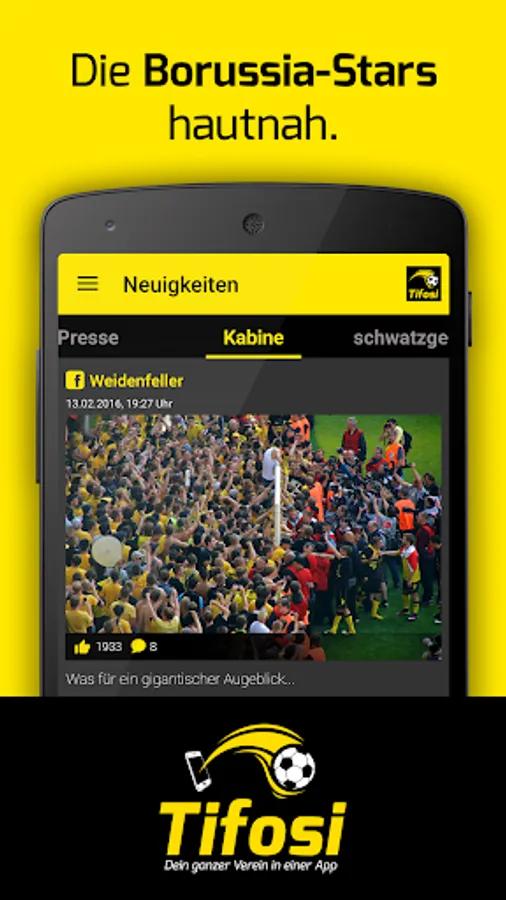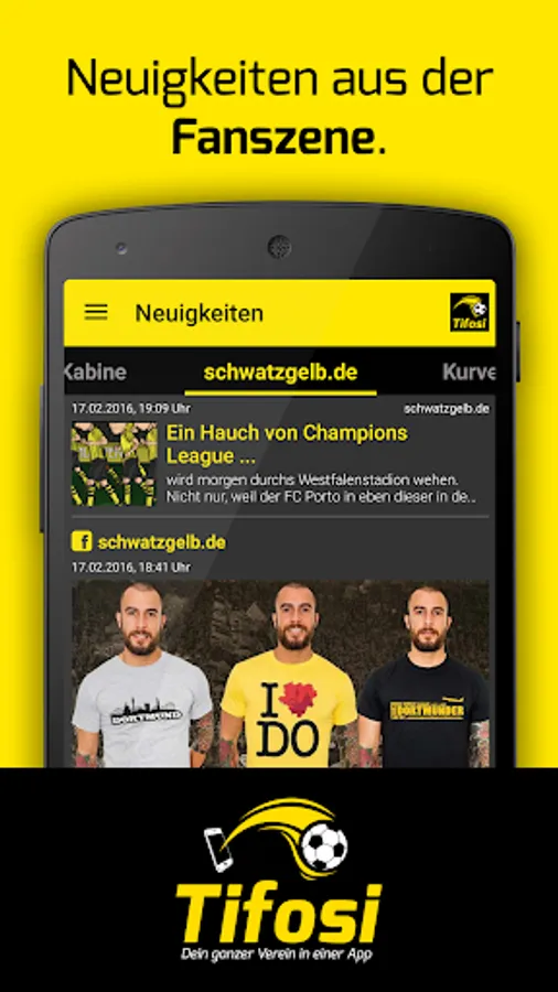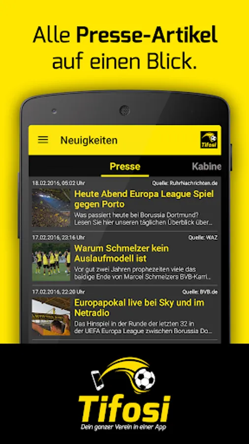 With "Tifosi 09" for Android you always have the latest news on Borussia Dortmund in view. Choose from more than 60 sources, which would like to receive BVB content you. More BVB in an app does not work!