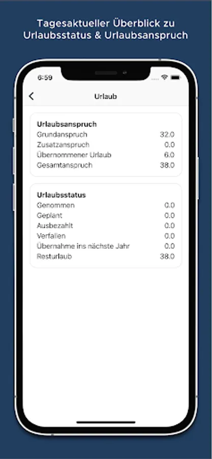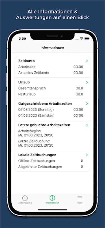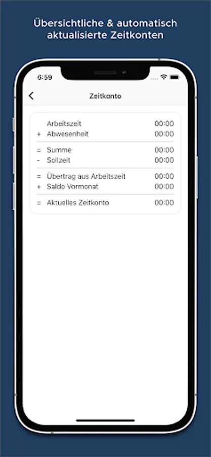 You can easily control your time bookings with one click using the time clock function. In the app you will also find an up-to-date overview of your time balances and holiday entitlement.