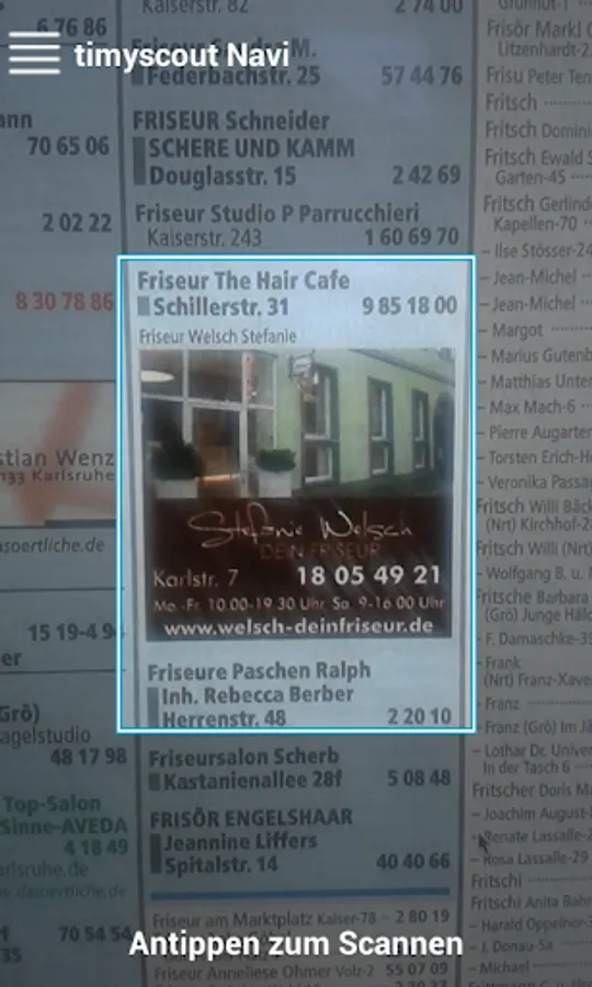 With timyscout simply photograph an ad or logo and can be initiated immediately from your location to the destination. You also get the contact information of the advertiser, such as telephone number, address or website.