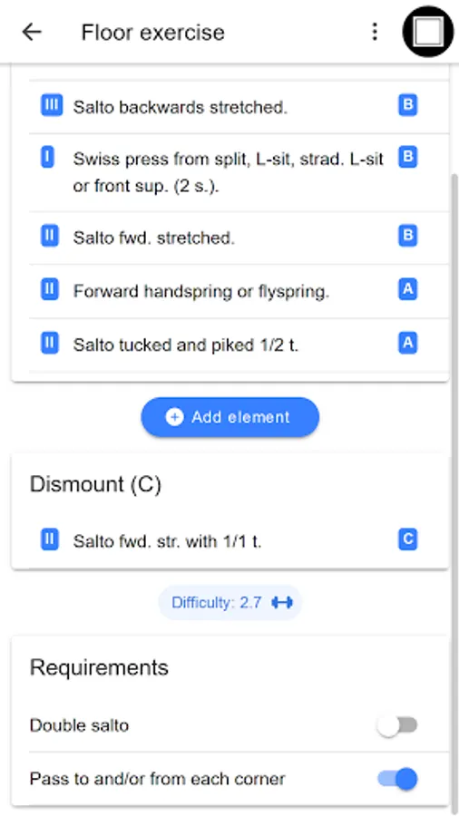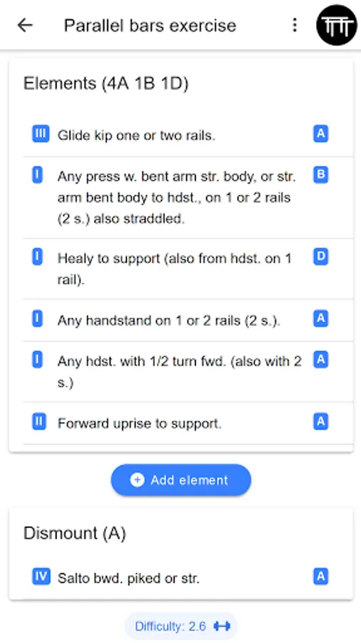 Smart Code of Points (CoP) knows all elements of the CoP and calculates the difficulty value (D-Value) of your gymnastics routine when entering the elements performed in your routine.