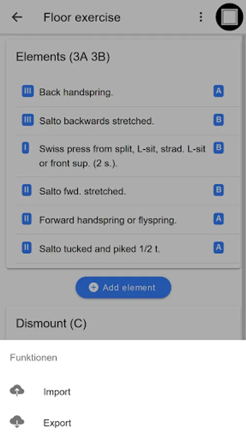 An import of the exported files is possible. This allows a routine to be sent as a PDF file and imported on another device. This allows gymnasts and trainers to easily share their routine and collaboratively find the best fitting routine.