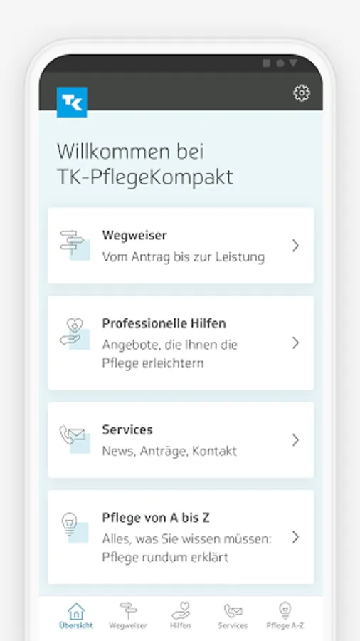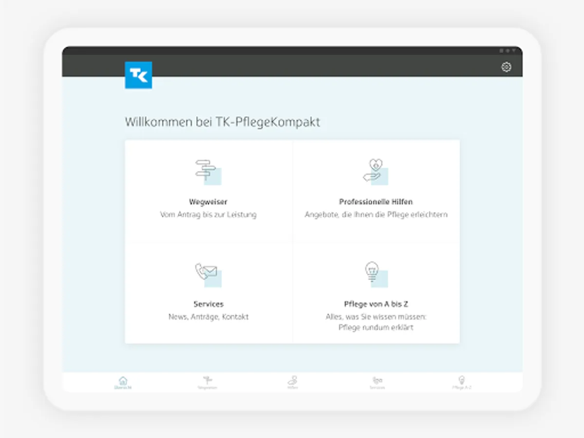 We support you with a lot of help and practical offers and want to make everyday care easier for you. Our service offers and a large area of knowledge enable you to act and give you security so that you are well informed and advised at all times. "TK-PflegeKompakt" can also be used by all those not insured with TK. Insured technicians also benefit from numerous services, such as the online application.