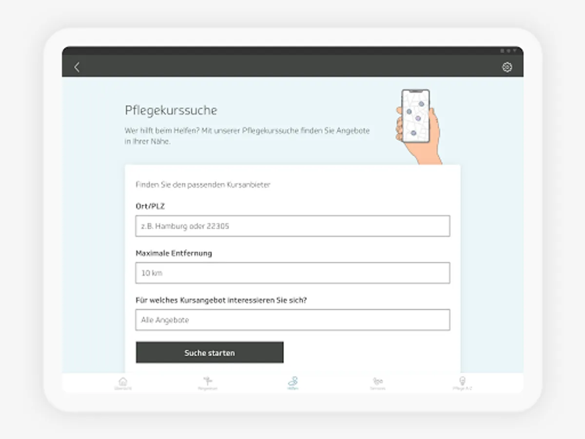 The TK-PflegeCoach supports you in an online care course for at home, which contains useful learning videos, as well as the TK-Care Guide, through which you can quickly and easily find suitable care services or homes. For relatives there is support through anonymous psychological online counseling. With the help of our nursing course search, you can also find contractual partners in your area who will provide you with specific knowledge on nursing topics - at your home or as a group course.