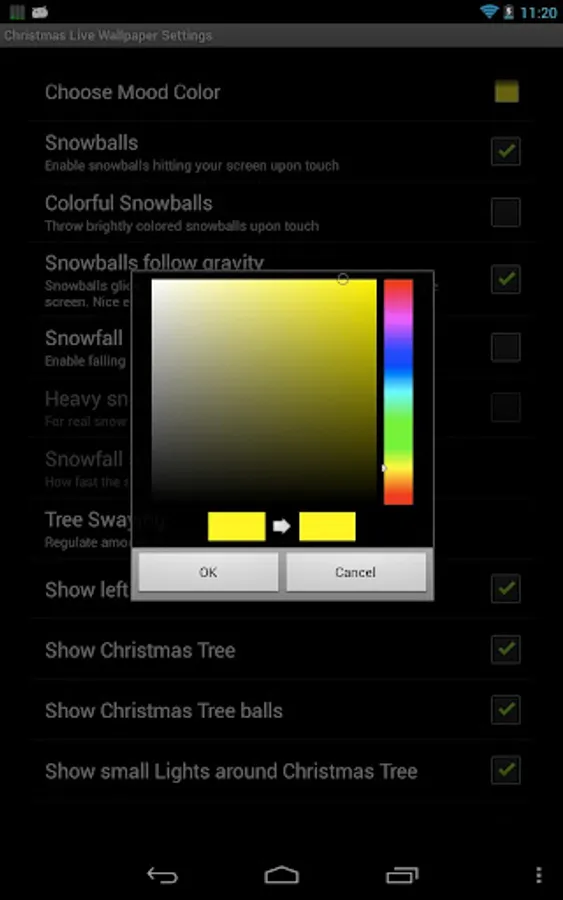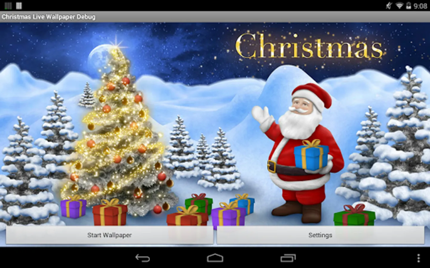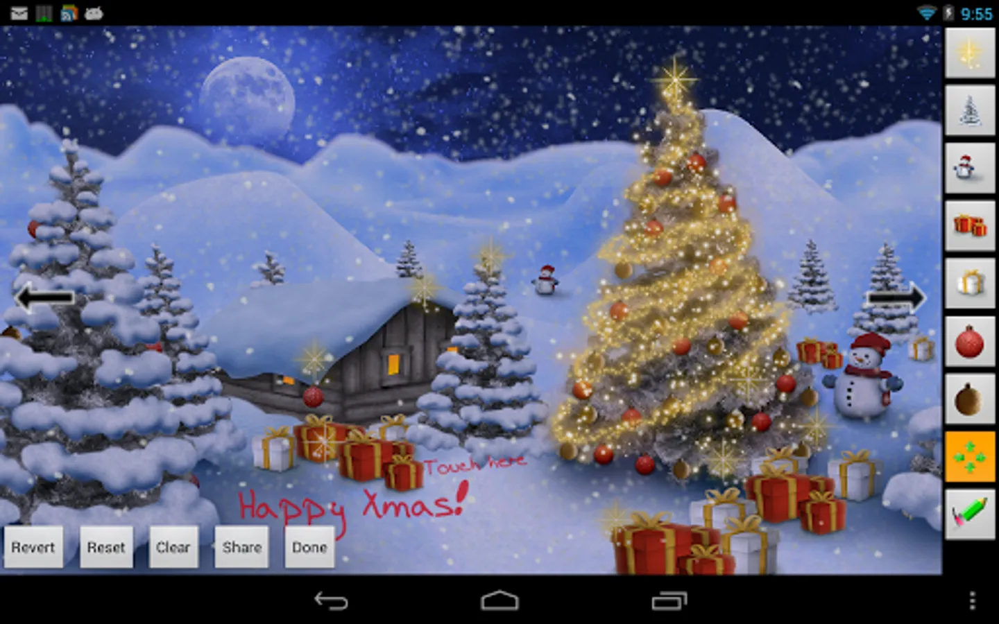 Gentle Snowfall, Snowballs flying when you touch the screen, softly swaying trees and flickering lights. Get this calm scene in the serene twilight of dawn with this Christmas Live Wallpaper. And also view holy night time with moon and stars and delicate sunrise, colorful snowballs, heavy snowfall, and much more in this full version. Customize the scene, move around Santa Claus, set everything as you like it with the Edit mode! Thank you for considering Christmas Live Wallpaper Pro for many more beautiful sights and plenty of options for your own personally created Christmas scene.