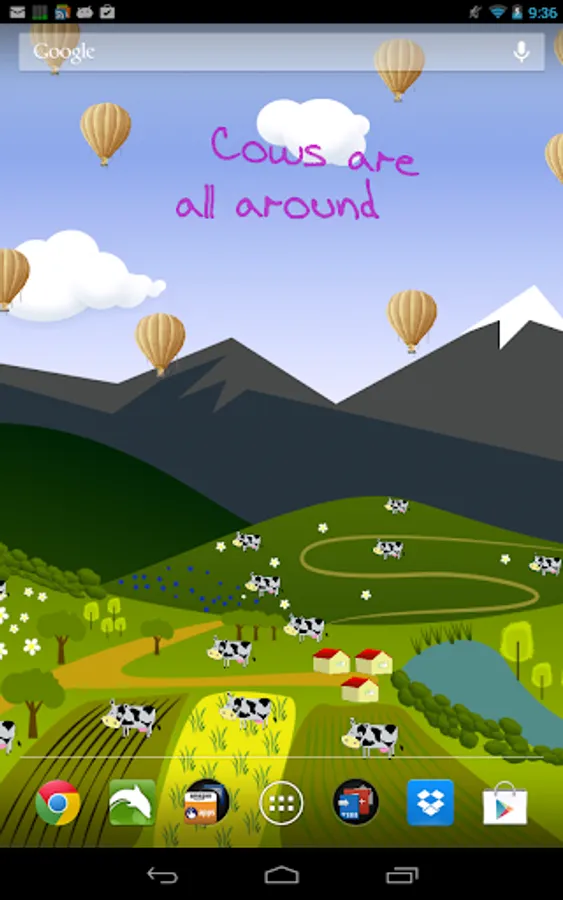 Cartoon Live Wallpaper: Have a rest and enjoy your free time by watching this cow land cartoon village with green hills, flowers, mountains and more. You will discover a place for meditation in everyday trouble. The peaceable comic cows are examples of slow and worthwhile life in peace.