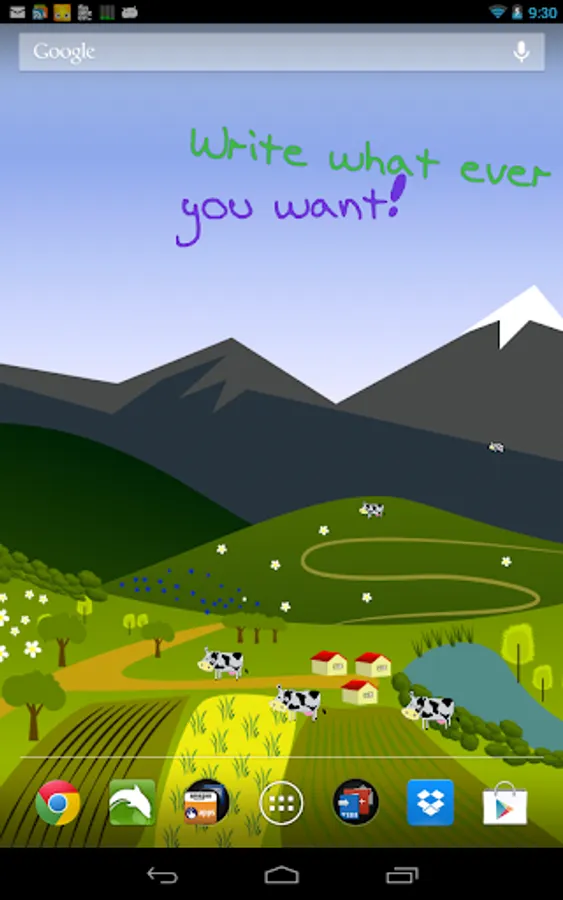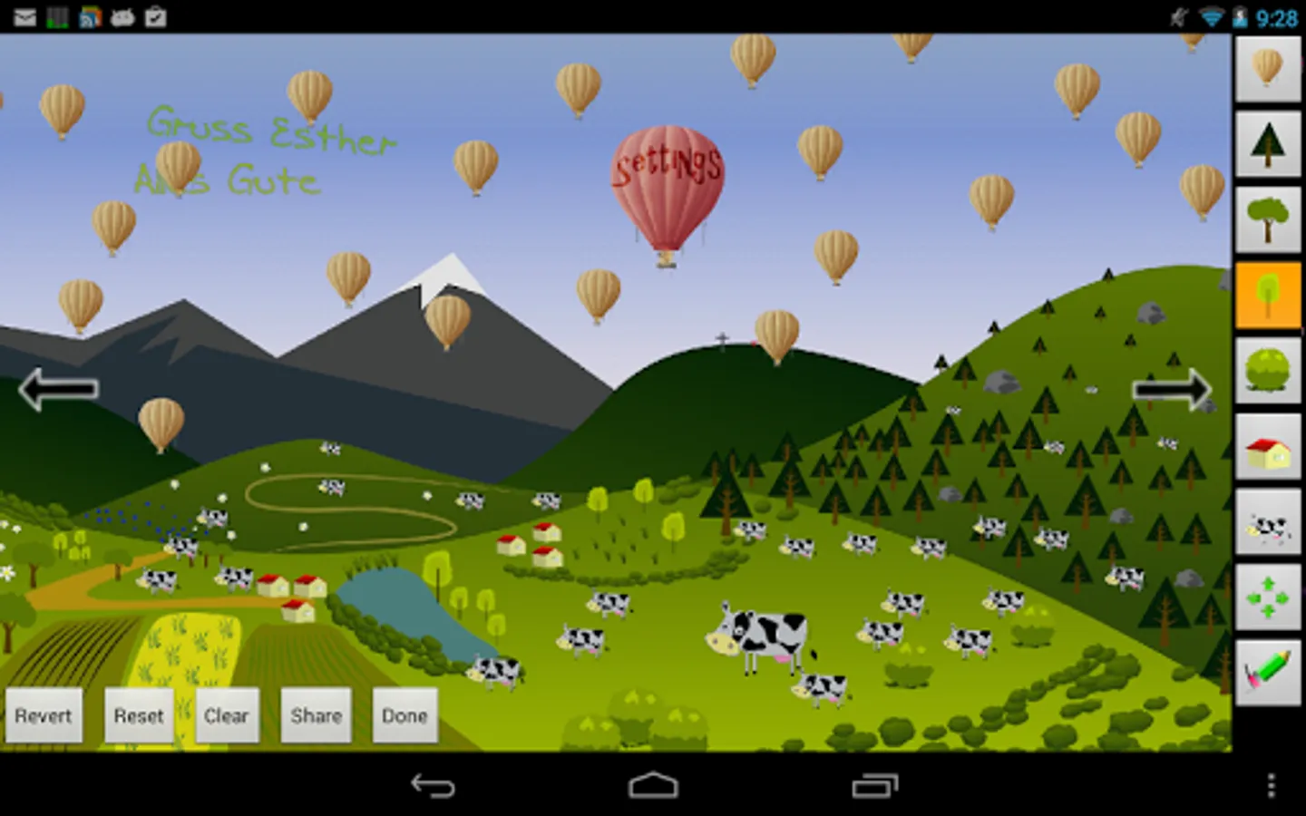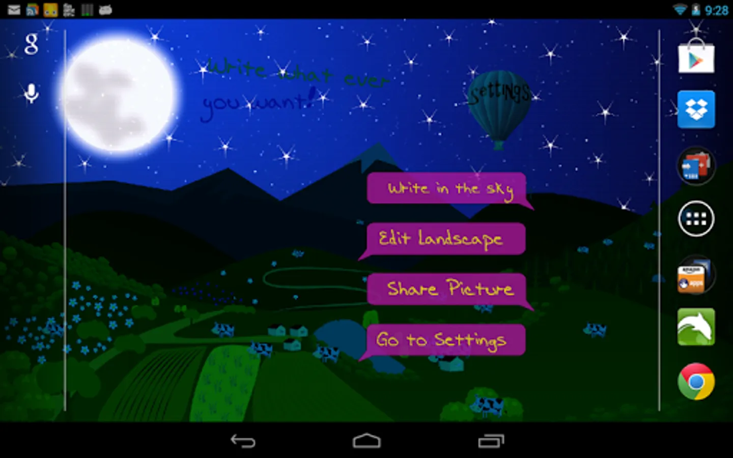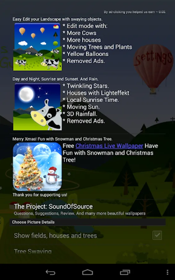 Use the outstanding Live Wallpaper Generator edit mode to create the cartoon toy landscape you are dreaming of. Enjoy the swaying trees, houses, shrub and the moving balloons. If you like, write your own personal message into the sky. And send it to your friends as an (animated) postcard. And, it is not always sunshine: You can let it rain or switch between sunrise, sunset and twinkling stars at night. Plenty of configuration options waiting for you, all in the pro versions of this app.