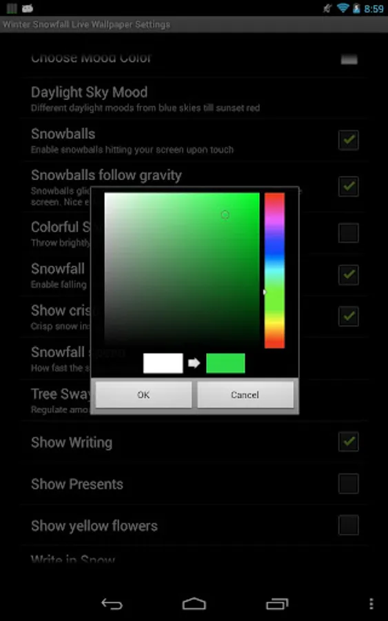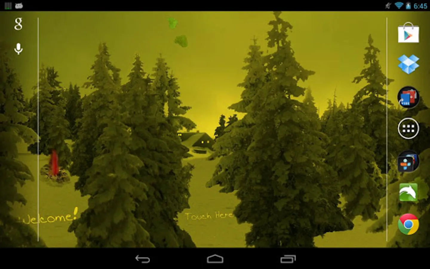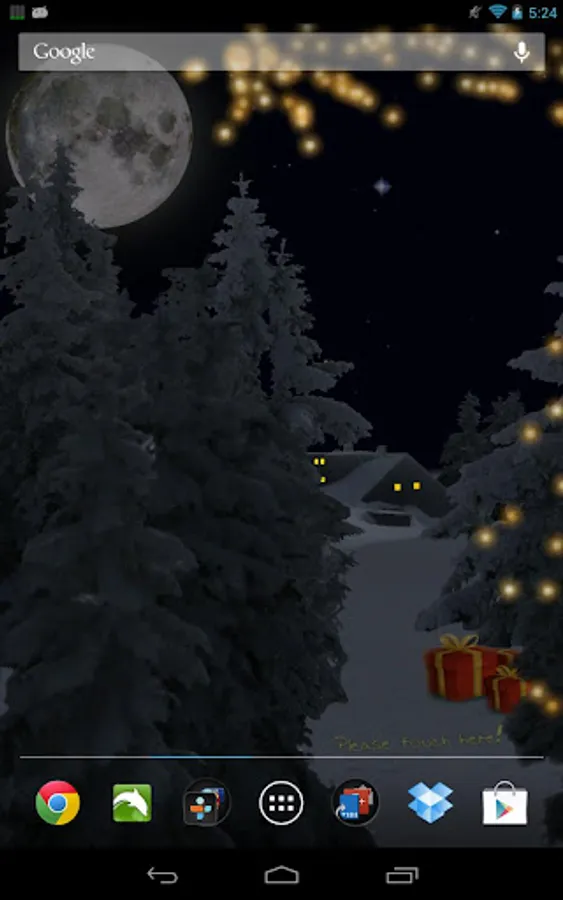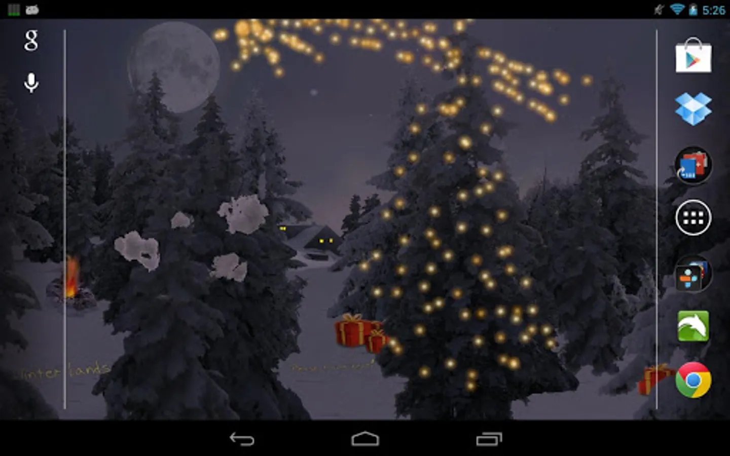 And watch the glowing fire at night with moon and stars, glittering Lights wherever you like (Edit-Mode!), five magnificent sky backgrounds, light in the hut (you can turn that on and off!), christmas presents (if the time is right) and the color of your choice for the overall scene in this Pro version. Here you also get lots of configuration options for the winter scene and overall function, and the great sunlight alarm clock! Thank you for considering Winter Snowfall Live Wallpaper Pro.