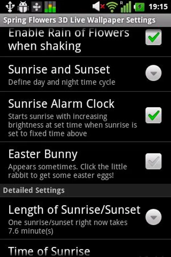 And watch the storm of flowers, the beautiful golden sunset, the gorgeous full moon and serene dawn. All this is provided by this full version of the live wallpaper! And much more, like, an alarm clock that wakes you up with golden light of southern dreams, and plenty of configuration options, too. Thank you for choosing Spring Flowers Live Wallpaper full version!