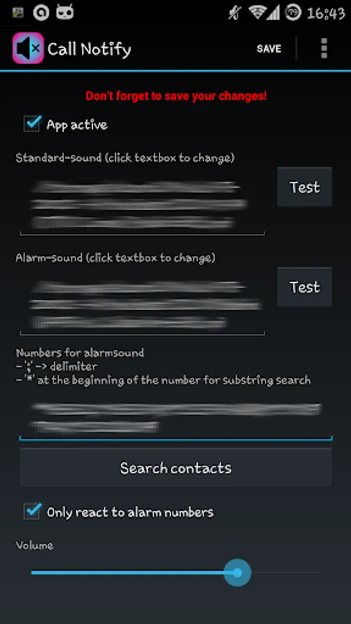 - If you checked "Only react to alarm numbers", the app only reacts, if the calling number matches one of the alarmnumbers.