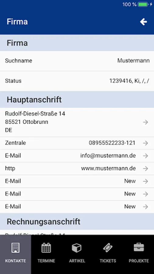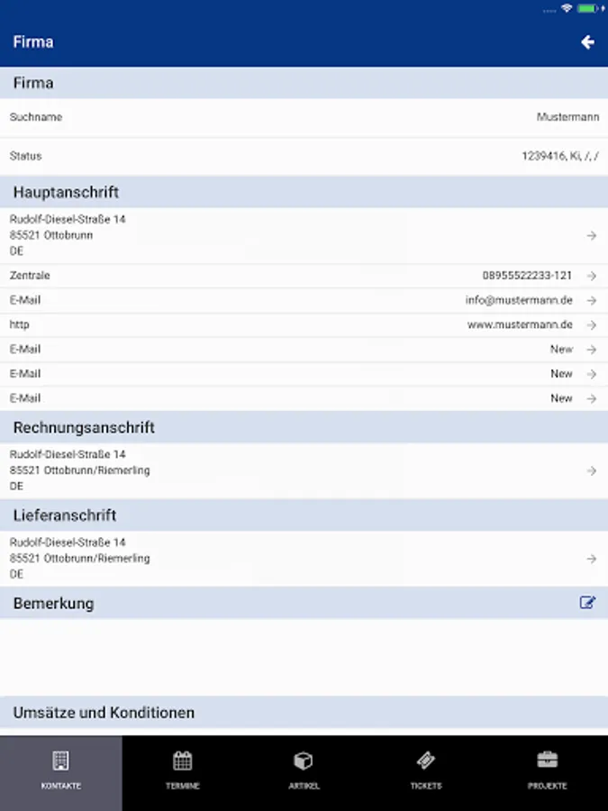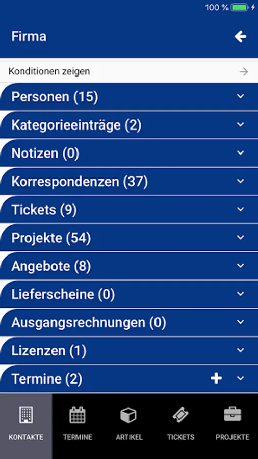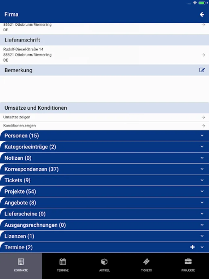 • Display of all currently entered category / CRM entries, notes, correspondence, service tickets, projects, offers, orders, delivery notes, outgoing invoices