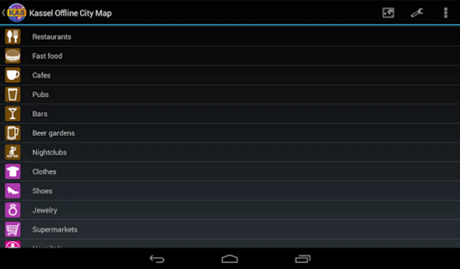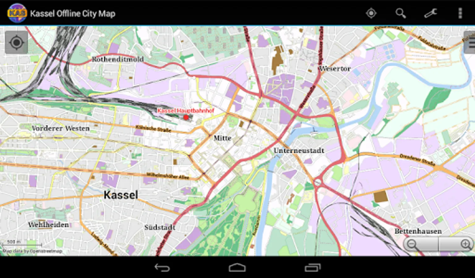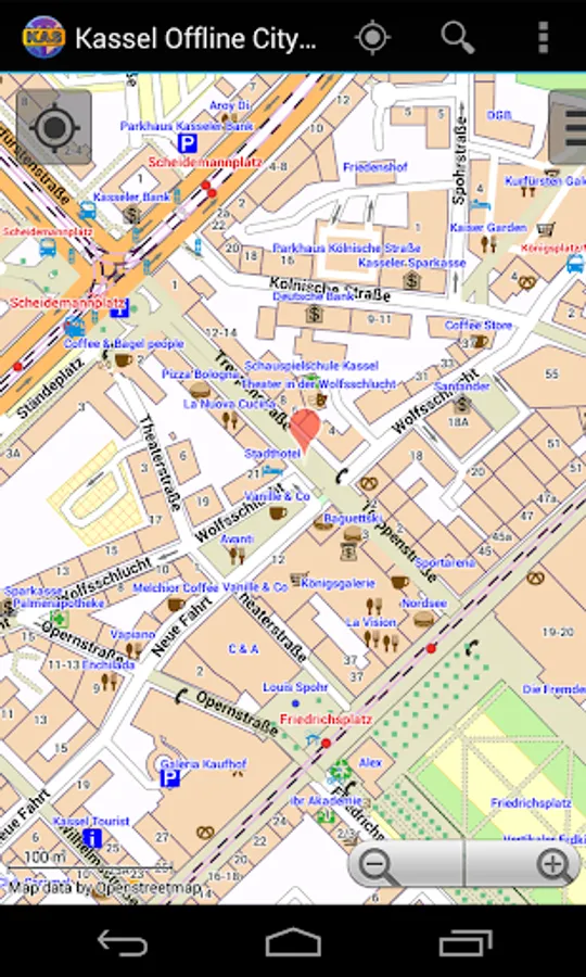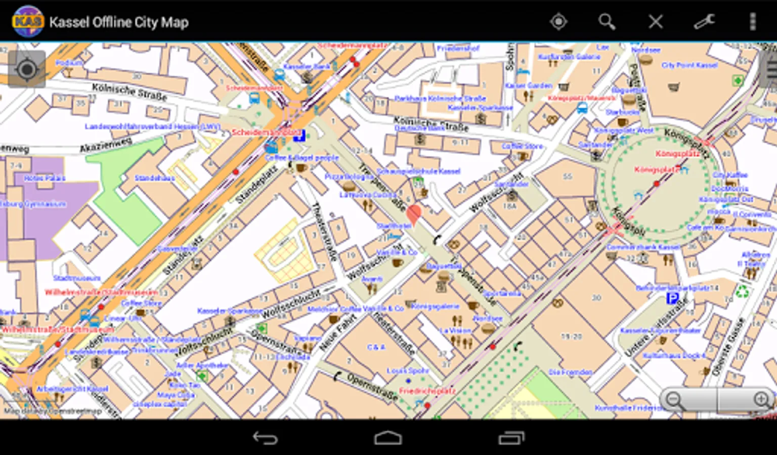 With this app you have the map of Kassel right in your pocket! It offers an interactive map that lets you browse the city at amazing detail. Additionally, it comes with a search index for locating streets, but also other places of interest such as museums, restaurants, cafés, hotels, sights and many more. After installing the app, no internet access is required anymore, neither for browsing the map nor for using the search functionality. As a result, the map loads reliably fast and it helps you reducing your data usage to stay within the limits of your data plan. Even if you're a tourist and do not have any mobile data plan at all, the map works equally well, independent of WIFI connectivity.