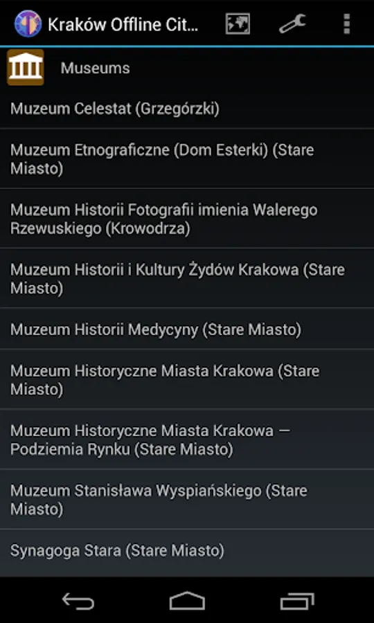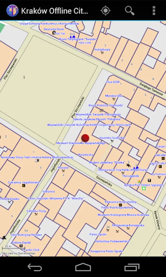 With this app you have the map of Kraków right in your pocket! It offers an interactive map that lets you browse the city at amazing detail. Additionally, it comes with a search index for locating streets, but also other places of interest such as museums, restaurants, cafés, hotels, sights and many more. After installing the app, no internet access is required anymore, neither for browsing the map nor for using the search functionality. As a result, the map loads reliably fast and it helps you reducing your data usage to stay within the limits of your data plan. Even if you're a tourist and do not have any mobile data plan at all, the map works equally well, independent of WIFI connectivity.