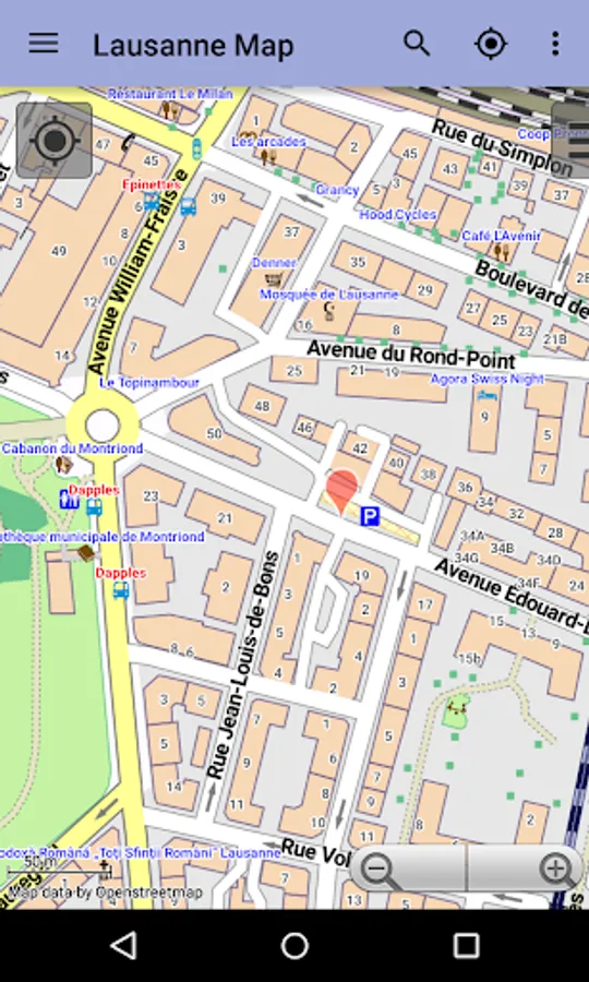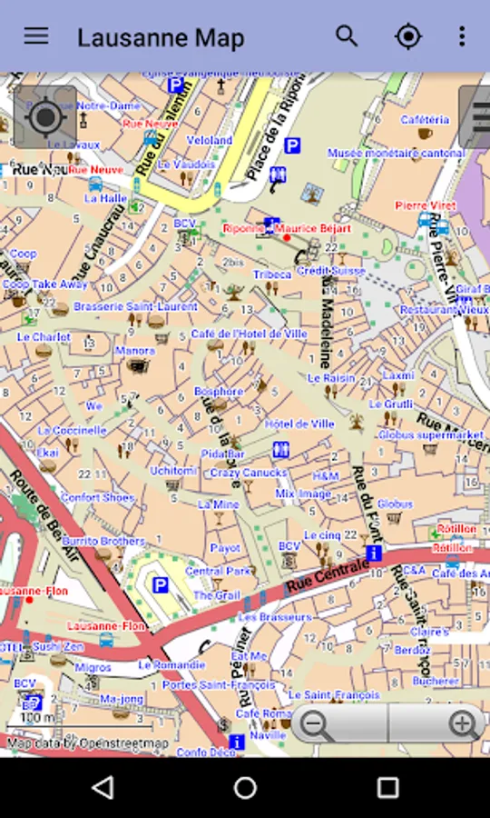 With this app you have the map of Lausanne right in your pocket! It offers an interactive map that lets you browse the city at amazing detail. Additionally, it comes with a search index for locating streets, but also other places of interest such as museums, restaurants, cafés, hotels, sights and many more. After installing the app, no internet access is required anymore, neither for browsing the map nor for using the search functionality. As a result, the map loads reliably fast and it helps you reducing your data usage to stay within the limits of your data plan. Even if you're a tourist and do not have any mobile data plan at all, the map works equally well, independent of WIFI connectivity.