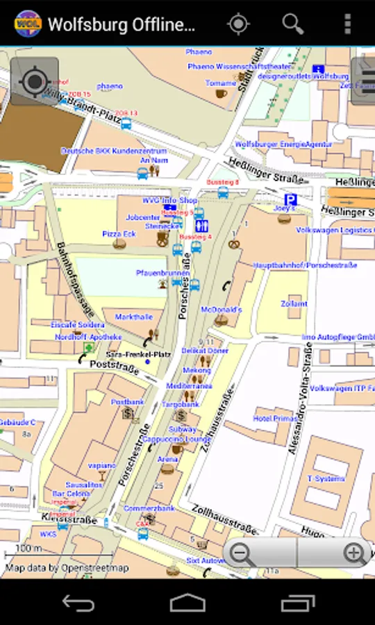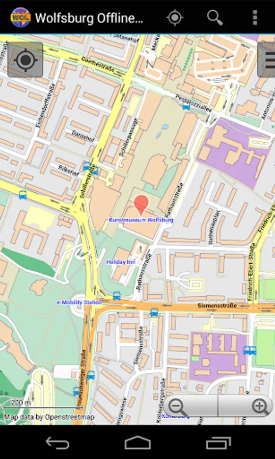 With this app you have the map of Wolfsburg right in your pocket! It offers an interactive map that lets you browse the city at amazing detail. Additionally, it comes with a search index for locating streets, but also other places of interest such as museums, restaurants, cafés, hotels, sights and many more. After installing the app, no internet access is required anymore, neither for browsing the map nor for using the search functionality. As a result, the map loads reliably fast and it helps you reducing your data usage to stay within the limits of your data plan. Even if you're a tourist and do not have any mobile data plan at all, the map works equally well, independent of WIFI connectivity.