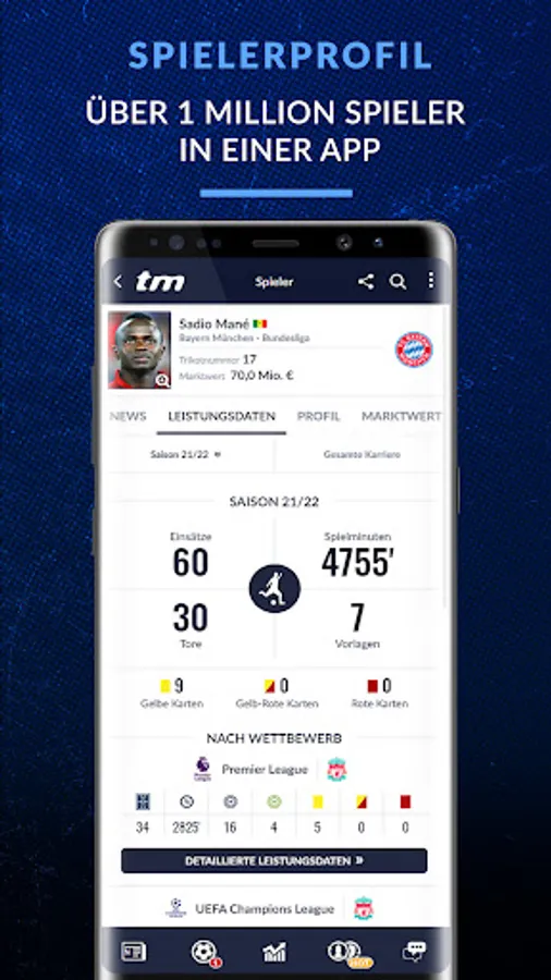 Over 1,000,000 player profiles give you an overview of market value, performance statistics, transfers, rumors and
