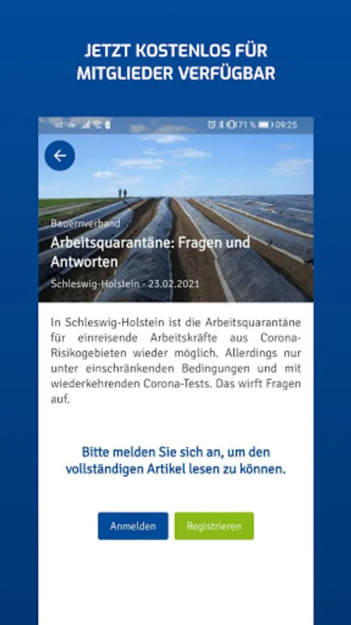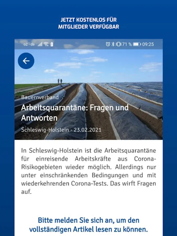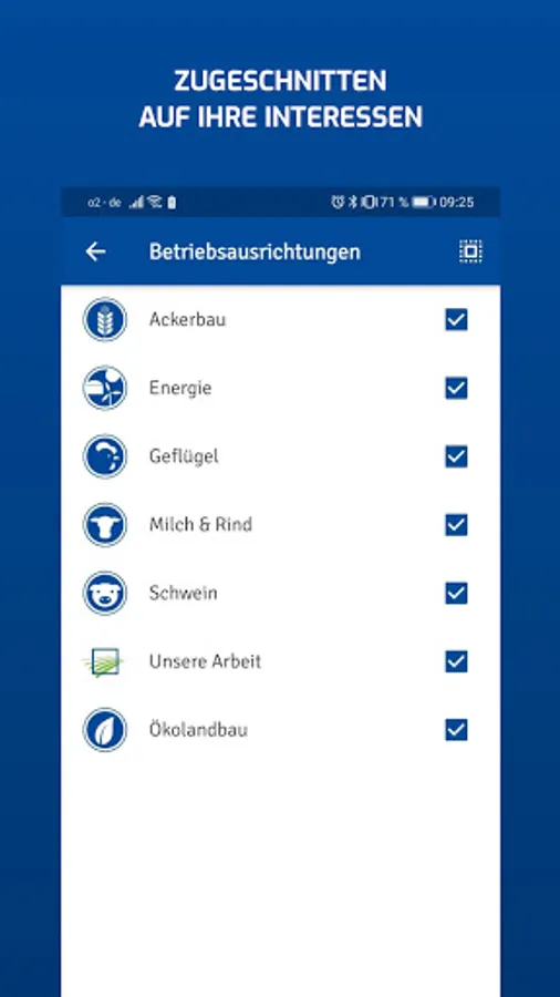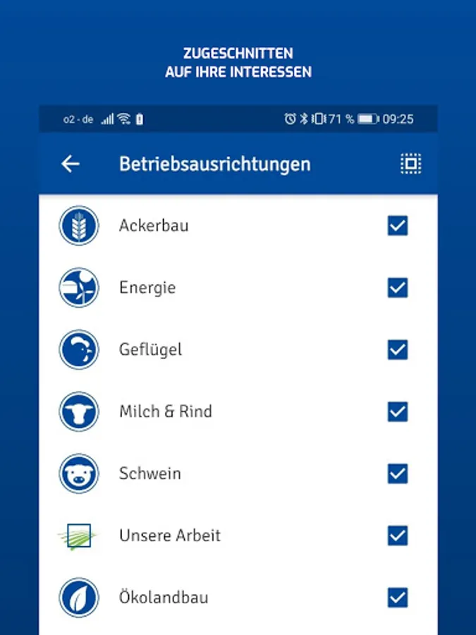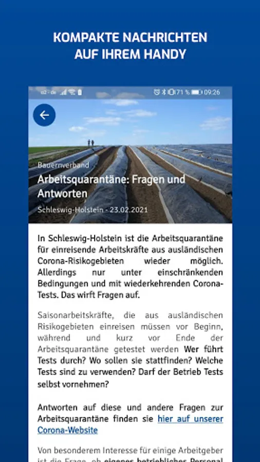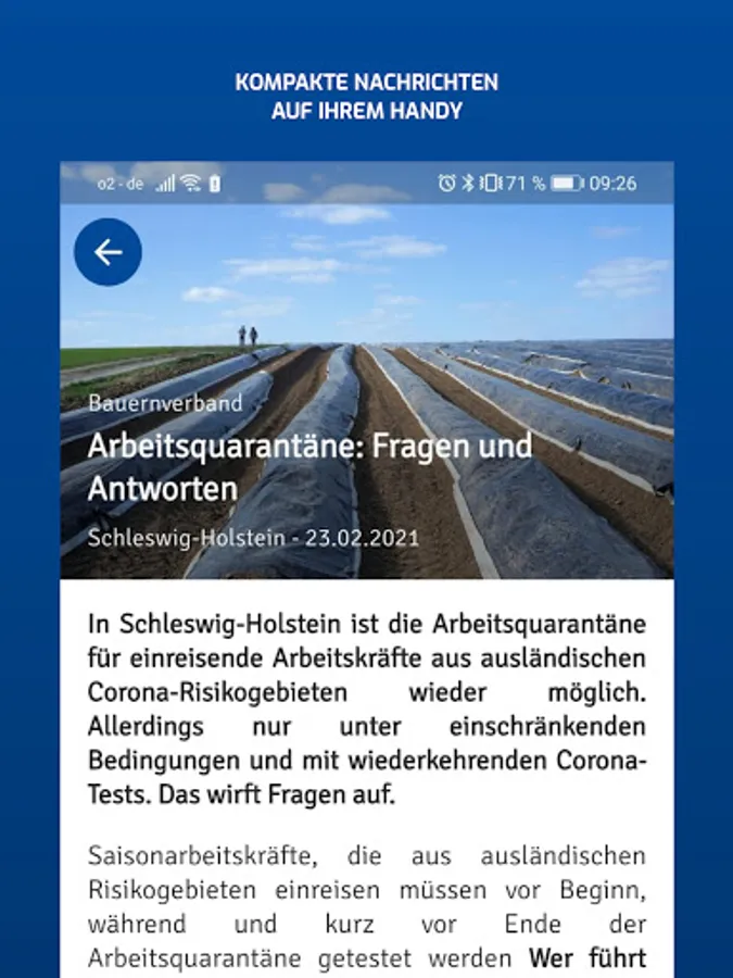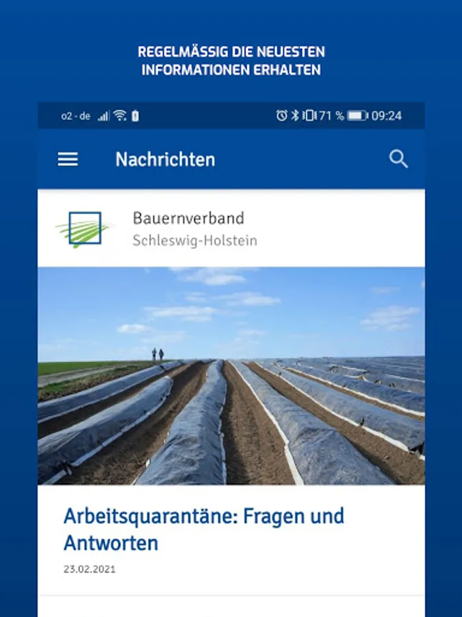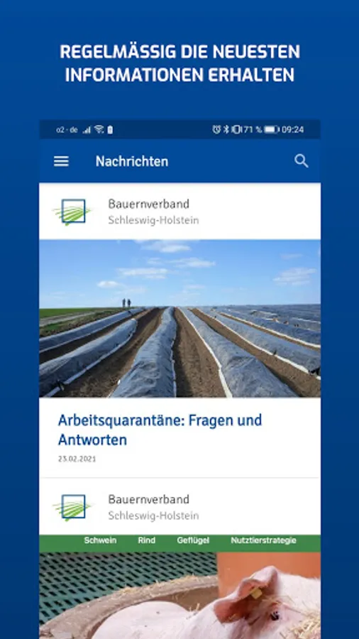 The new news app from the farmers' association regularly provides the latest information about and about agriculture. Almost everything that is important to you is sent as a compact message to your mobile phone - regardless of whether you are in the field, in the stable or in the kitchen. The individual selection of your own circle and the operational orientation enables the flow of messages to be tailored even more to your interests. You can also choose your neighborhood circle to always be well informed. In addition, the notification display on the smartphone screen helps so that you do not miss any new messages.