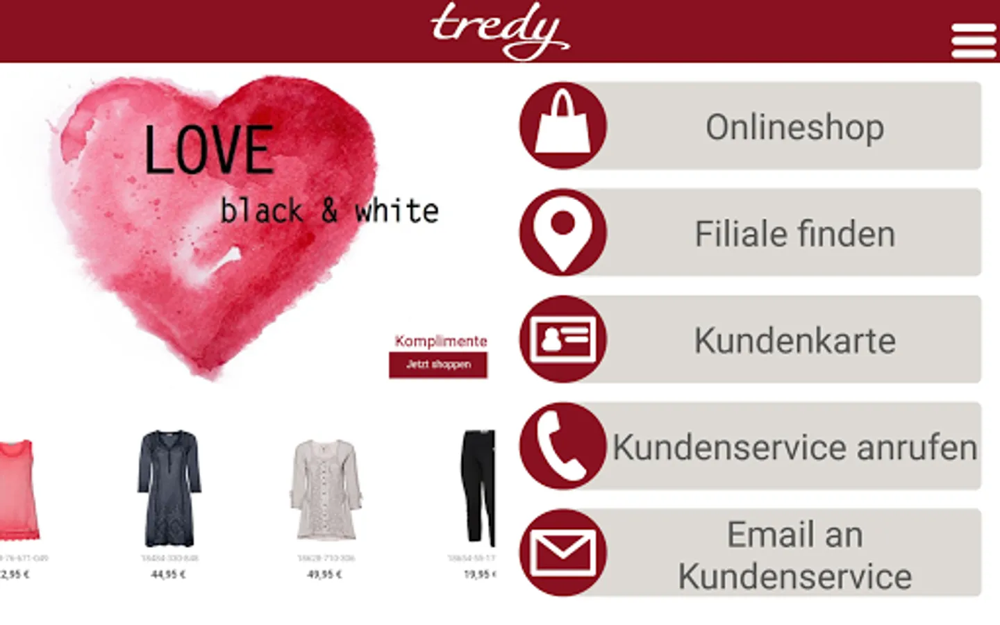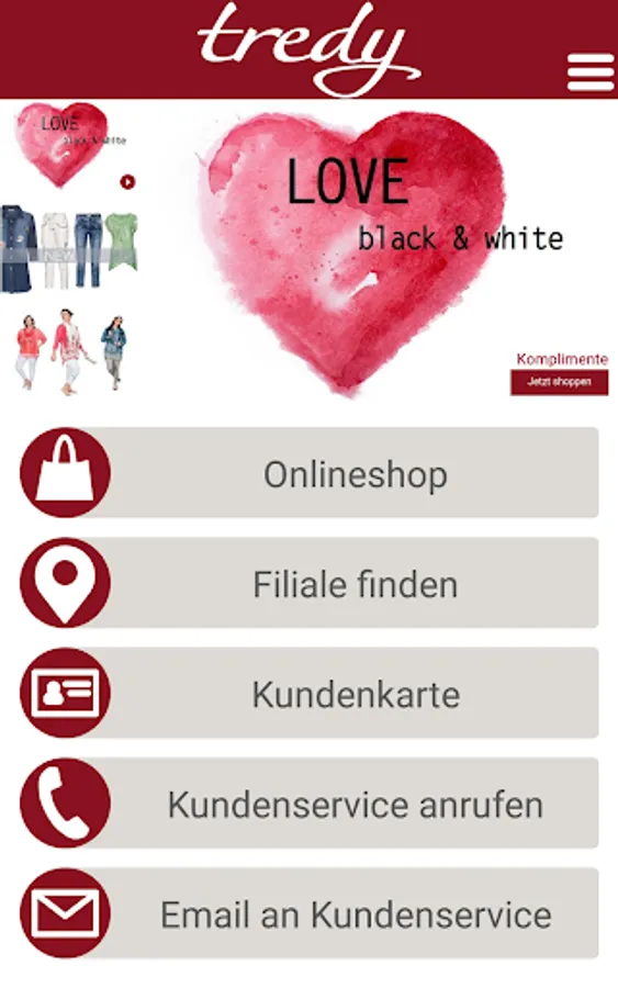 Our user friendly TREDY-fashion-app gives you the perfect shortcut to our current fashion and our Serviceleistungen- anytime, anywhere.