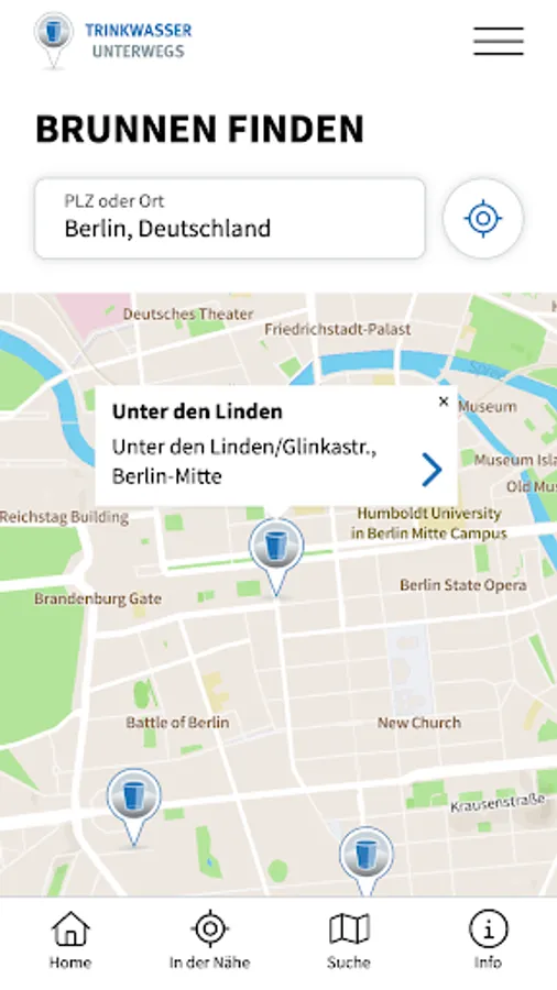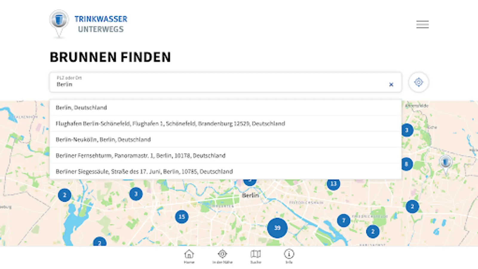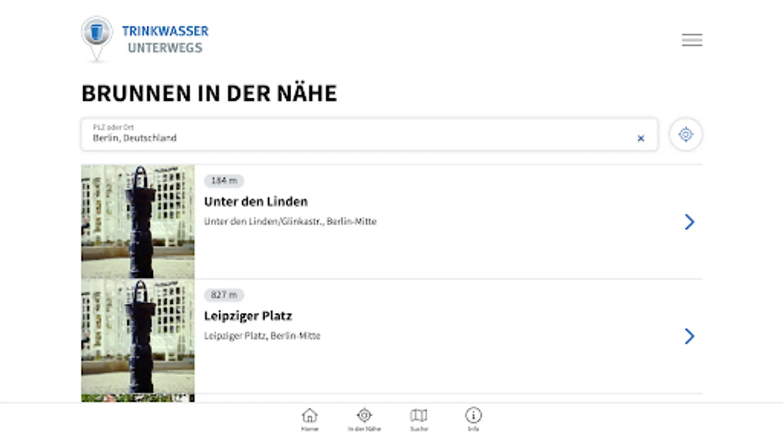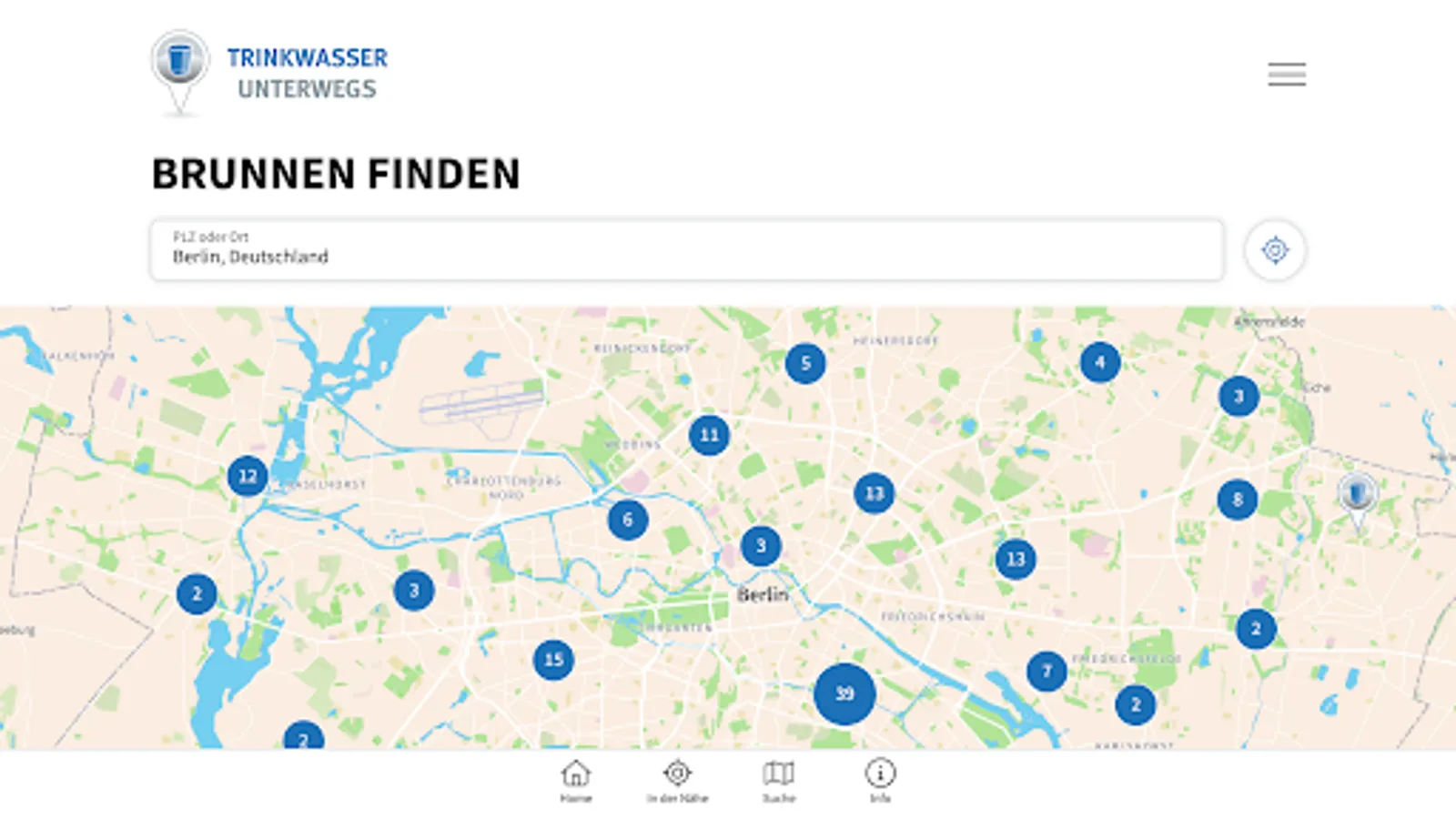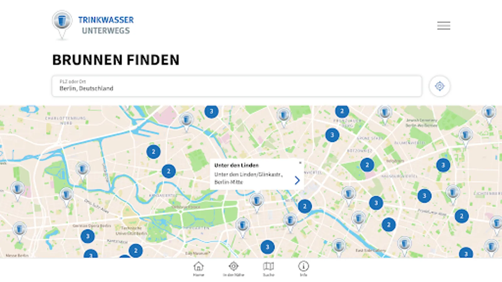 With the fountain app you can find public facilities nationwide where you can get fresh drinking water for free. Ideal for everyone who is on the go and needs a cool refreshment. You will find the nearest location displayed on the map and you can also search for fountain locations in advance when planning your trip.