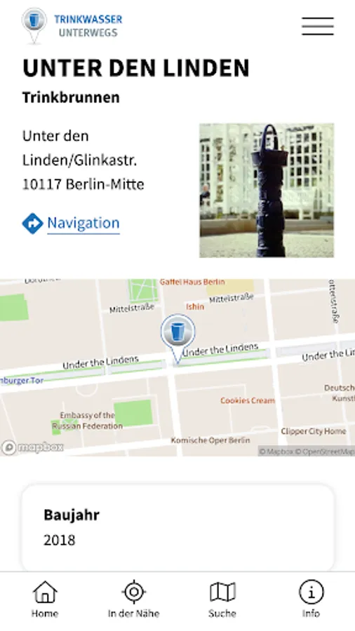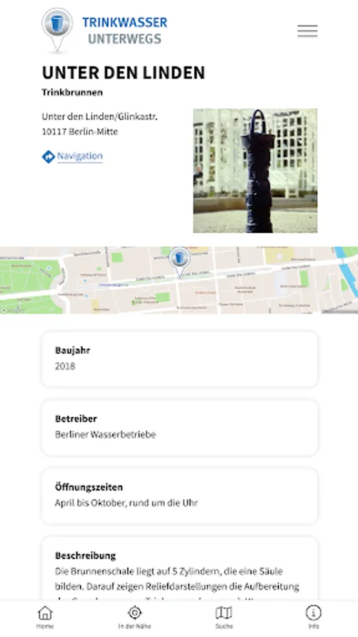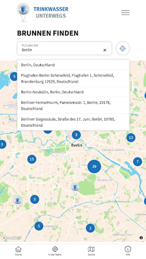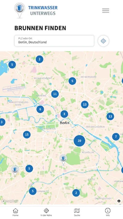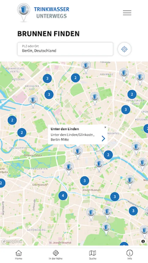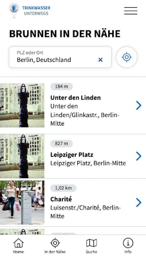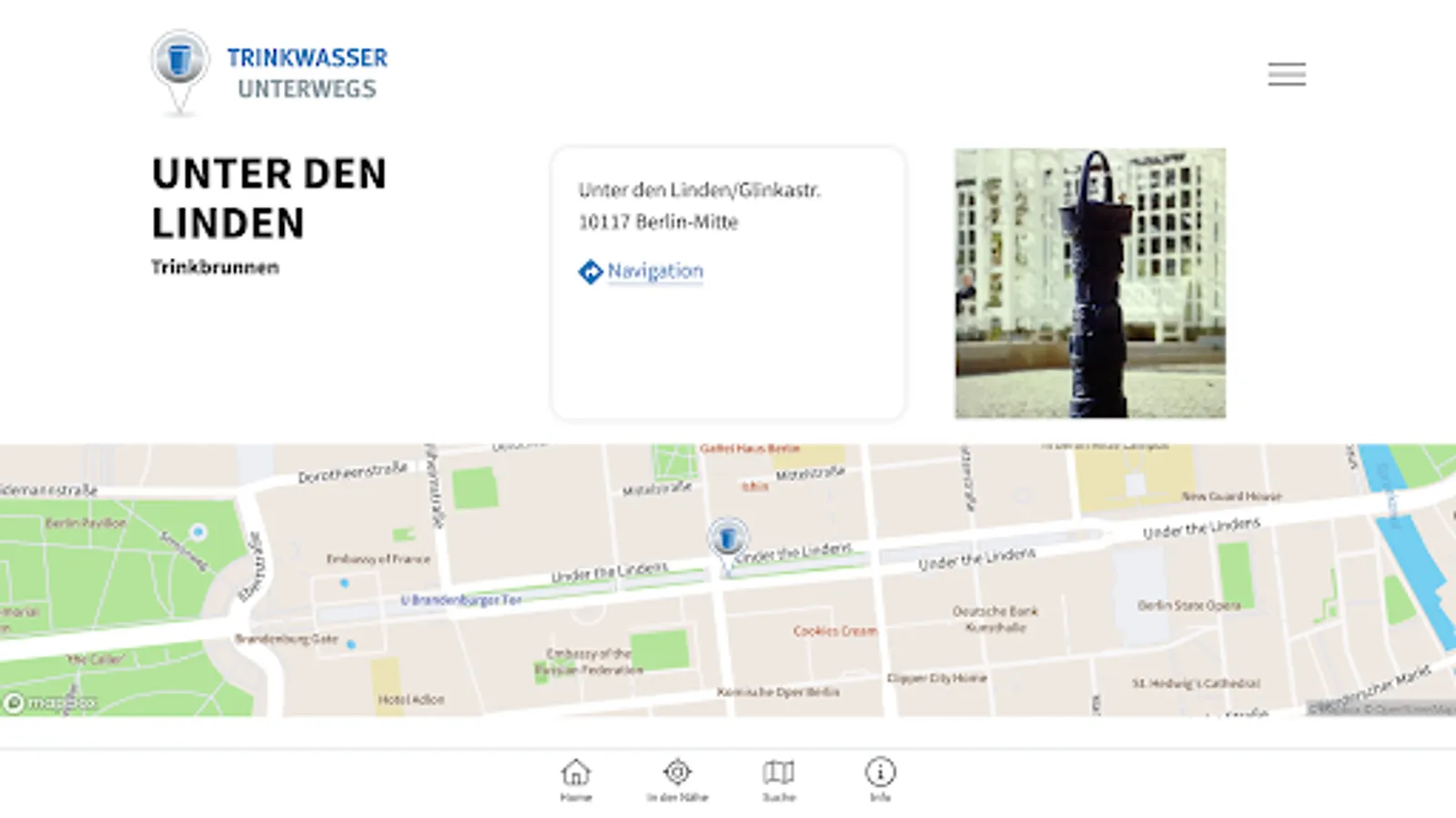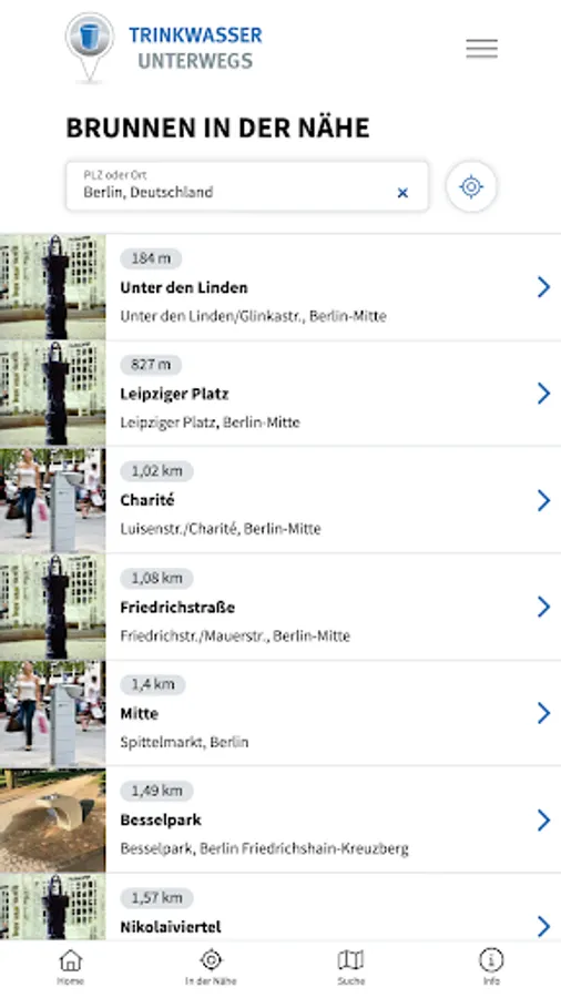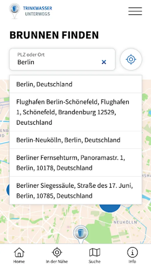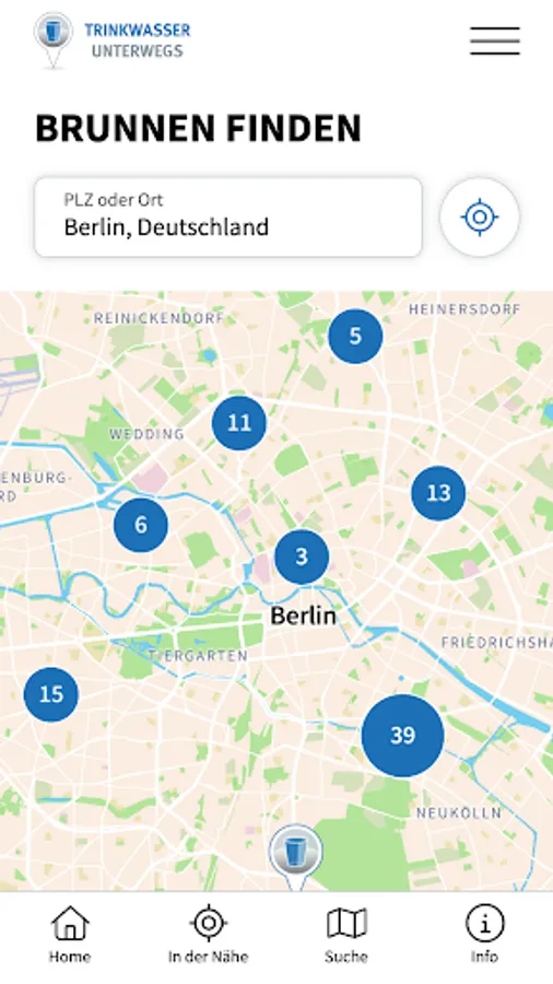 With the fountain app you can find public facilities nationwide where you can get fresh drinking water for free. Ideal for everyone who is on the go and needs a cool refreshment. You will find the nearest location displayed on the map and you can also search for fountain locations in advance when planning your trip.