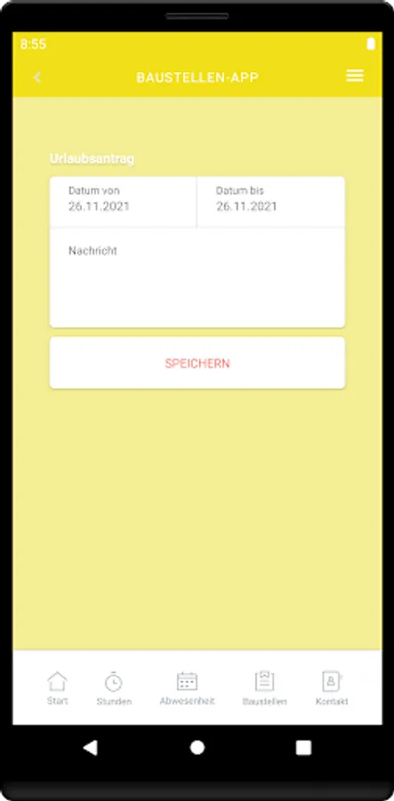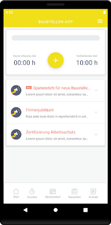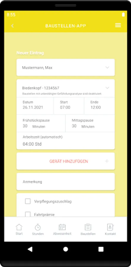 The construction site APP enables the daily times and work performed on the respective construction sites to be recorded directly via the smartphone. In addition, all relevant information and contacts on the individual construction site projects can be viewed and special functions for foremen can be used to create daily construction and hourly wage reports.
