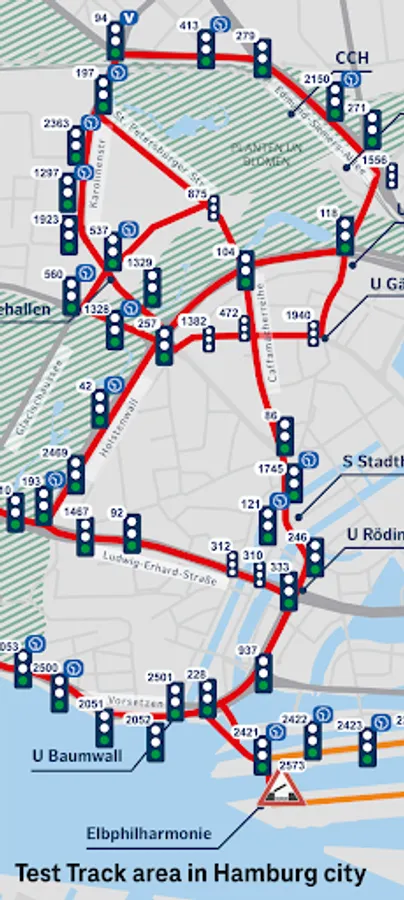 The Traffic Light Assistant Hamburg provides phase and forecast information about traffic lights in the city center of Hamburg.