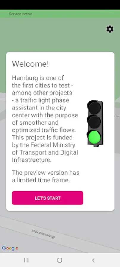 The Traffic Light Assistant is a location and map-based service. The service determines the traffic light systems relevant to the user based on the position of the user and his driving direction and provides signal phase information and a forecast of the next change of phase of the traffic light. The service can be configured as driving a car, e-scooter, bicycle, or truck, to indicate the driver the appropriate speed level. By providing the traffic light data in advance the app will support a more relaxed driving behavior and can positively influence the traffic flow. Furthermore, an additional collision warning function is integrated. It calculates possible future collisions of road users based on the position and trajectories of several users in a so-called accident hotspot (e.g. at an intersection). Road users are warned in good time before the collision with other road users will happen or notified of unavoidable collisions with an emergency warning.