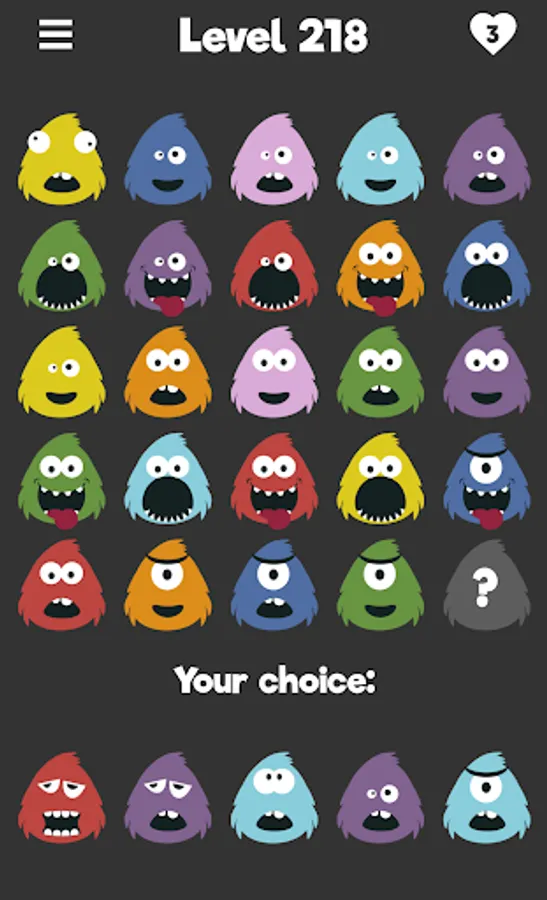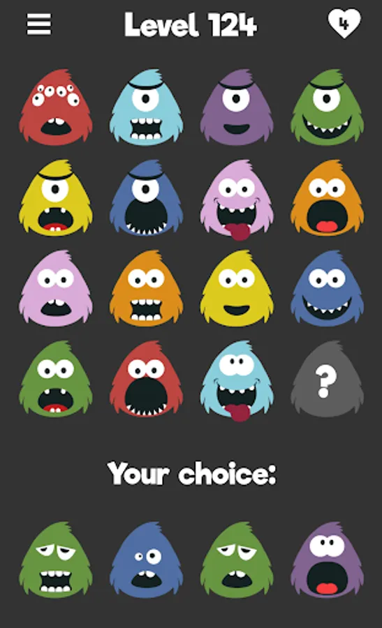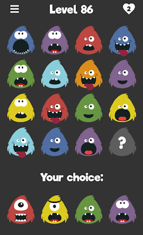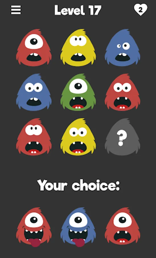 Monster Quizzy is a free puzzle game. Find the monster that matches the others. What do they have in common? Is there a pattern? Try to find the best fit to reach the next level and unlock new monsters.