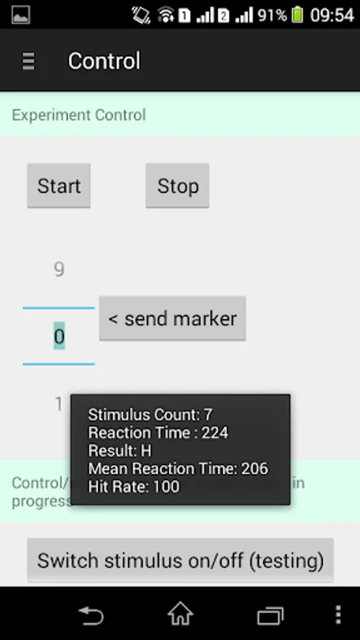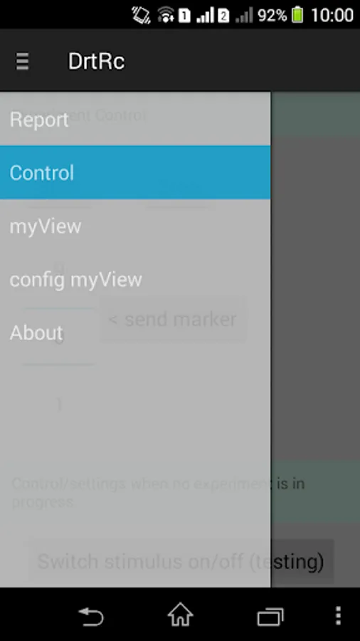 * Control: On this screen, commands can be send to the Arduino DRT device. E.g., start/stop. Or switch stimulus on, when no experiment is running to test the setup. Experimental conditions can be also labeled with markers. E.g., send marker '1' to tag that the subjects is now in situation '1'.