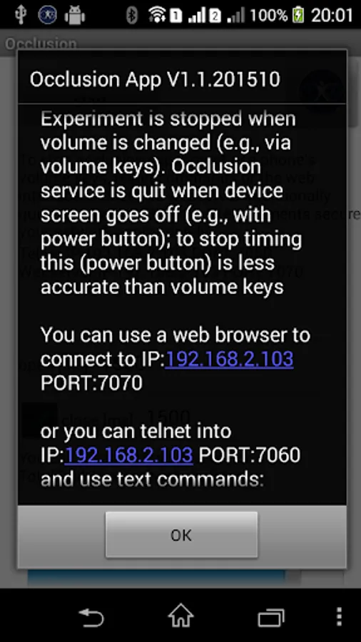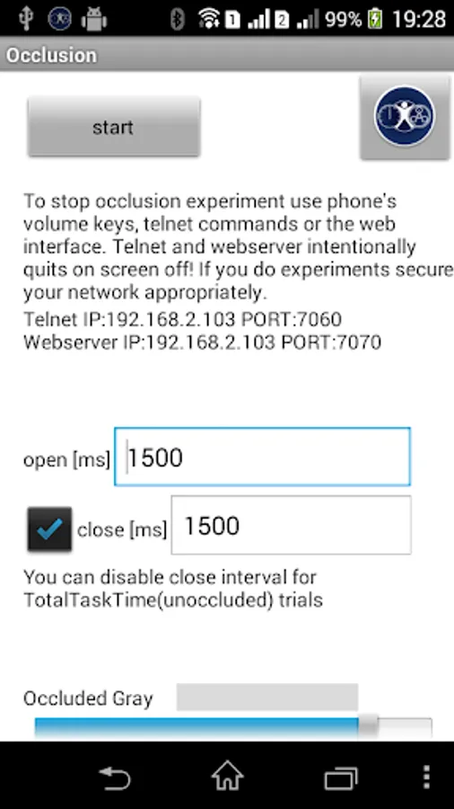 The intention of the app is to bring the 'occlusion feeling' to an Android device. So, you can get the occlusion idea in a lecture room (student) or on your desk (software/HMI developer). Before using the app in experiments please note the information on our site. For final laboratory tests we still recommend the classical shutter goggles.