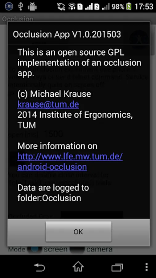 The app has capability, to use the build-in camera for occlusion (camera screen visible, camera screen occluded). The idea was to put a tablet between the device or task under test and the test subjects’ eyes. Our pretests were not promising. Maybe, with the upcoming capabilities of e.g., 3D goggles and virtual reality we can revitalize the idea in the future.