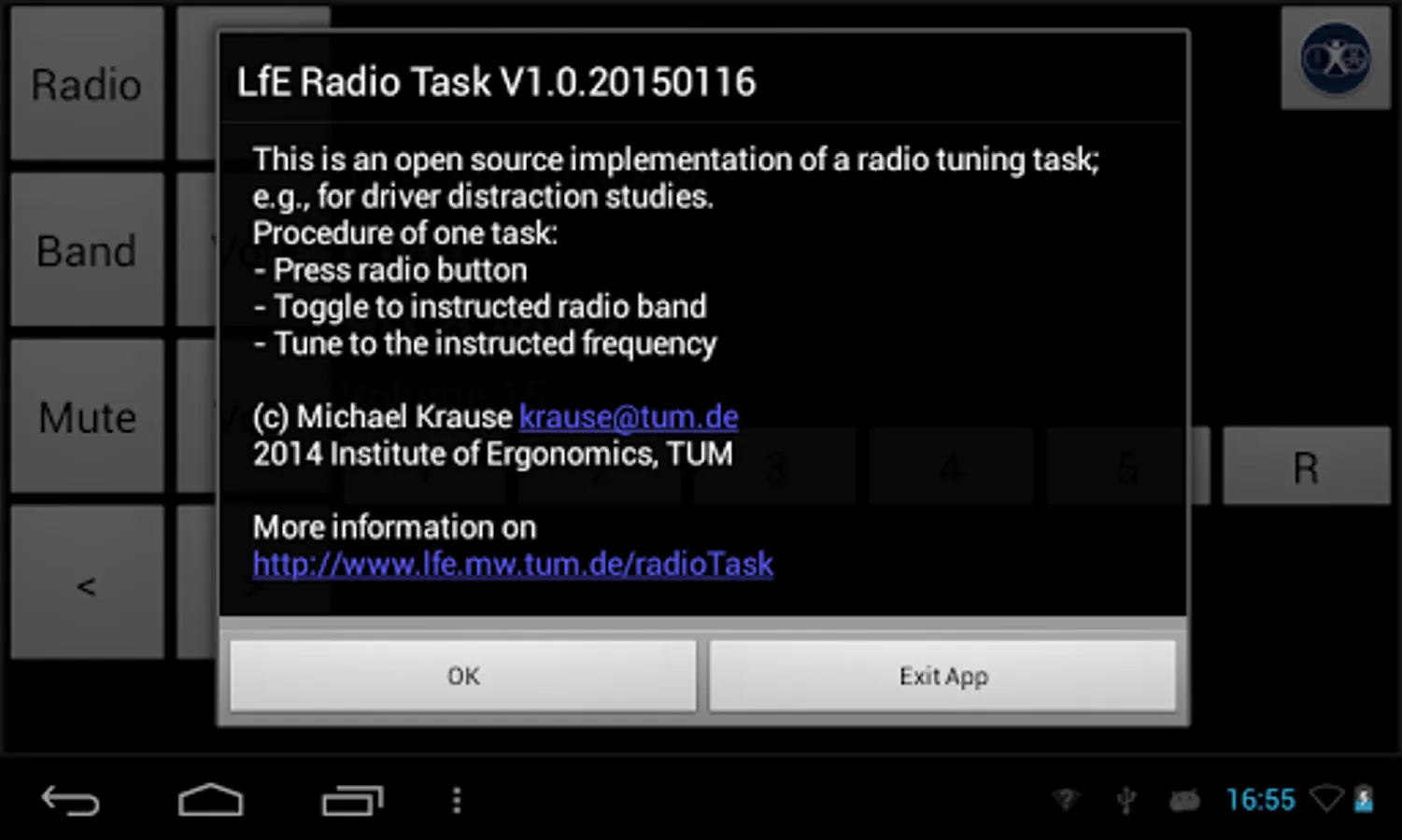 So, this app implements an AAM-like radio tuning (with some modifications) on a mock-up radio interface for Android. At the moment the data basis and evaluations are not sufficient to say, it is a replacement for the original hardware radio. If it is further devoped and tested it maybe can fill the gap between the highly specific and artifical tasks (e.g., SuRT and CTT) and natural tasks (e.g., phone calls). At the moment we typically apply it e.g., when demonstrating or testing eye-tracking or quickly need a secondary task. For teaching, e.g. Lane Change Test (LCT), also smartphone setups work fine.