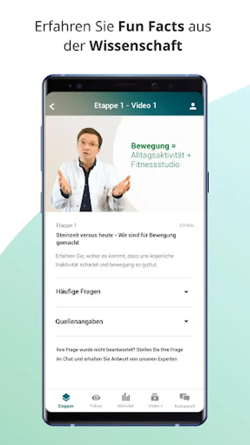 Download VIDEA BEWEGT for free and look around the app at your leisure. Familiarize yourself with the structure of the program and get to know your instructors. You can try out the first stage free of charge and without obligation. If we have convinced you, you can then purchase the complete course for €130.