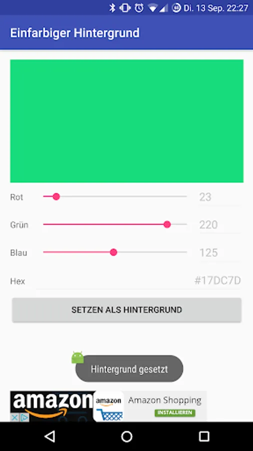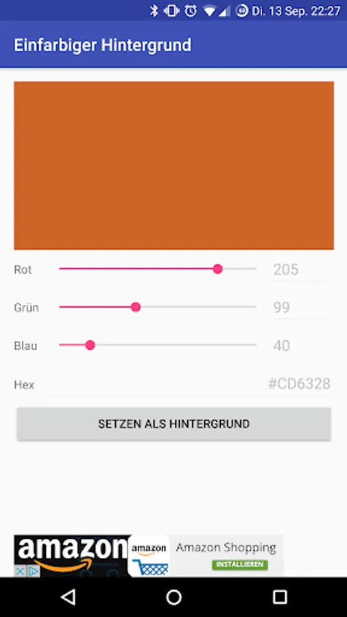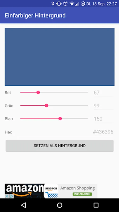 Select your color or enter the RGB (Red-Green-Blue) Code. The App shows you immediately the result of your selection. Push the button to select this color as your plain coloured wallpaper.