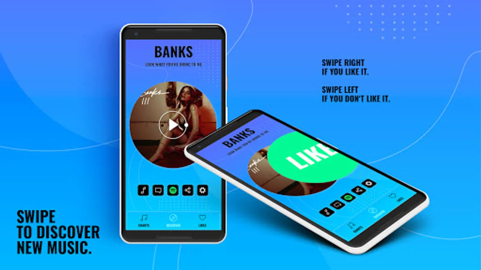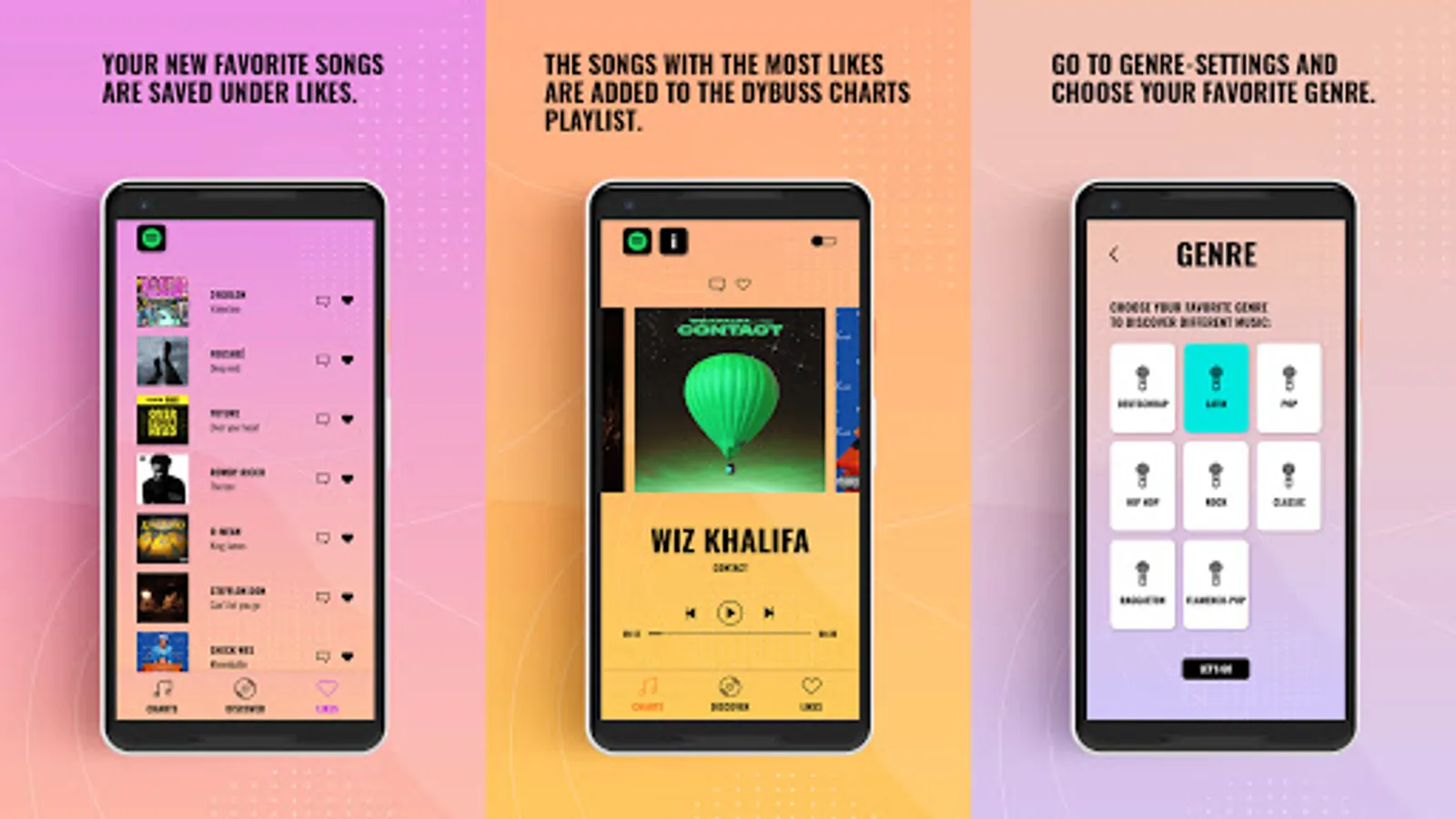 This music social media platform allows you to discover new music by selecting a respective genre. Use your spotify-account to login and you're ready to go. If you like a song swipe to the right and it will be added to your favorites ("dybuss favorites"-playlist in spotify). If you don't like the song, simply swipe to the left.