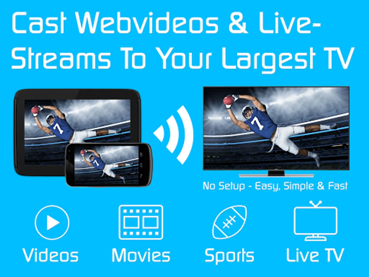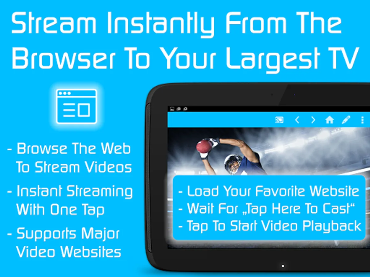 Video & TV Cast is the ultimate streaming browser app (10+ million users) to stream and watch web videos, online movies, livestreams and live tv shows on Chromecast, Samsung TV, LG TV, Sony TV, Hisense TV, Sharp TV, TiVo, Roku, Fire TV, DLNA and Google Cast / Android TV powered devices (TVs, media centers and gaming consoles).