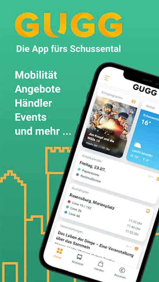 With GUGG you will find all relevant information for your everyday life in the Ravensburg / Weingarten region: weather, events, cinema program, parking guidance system, waste calendar, bus departures, availabilities tws.rad and shopping guides are just a tap away and can be completely personalized.