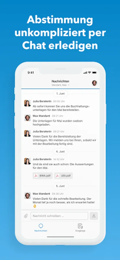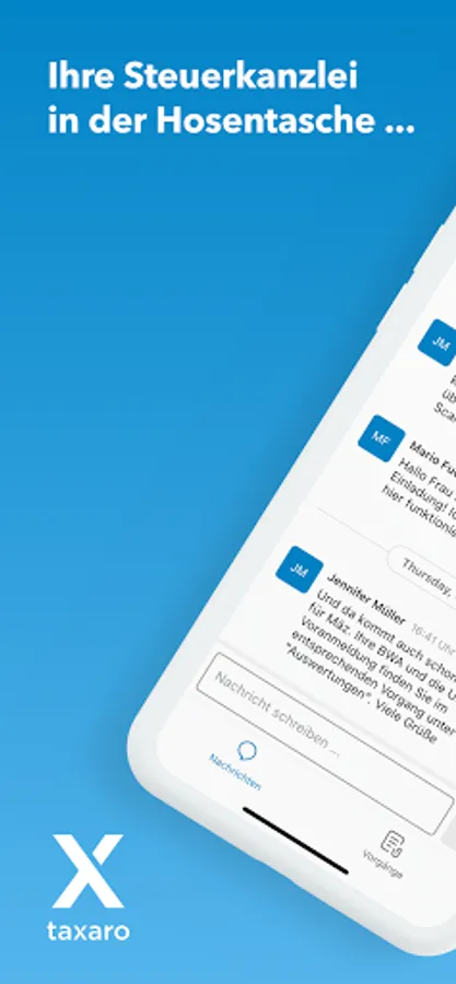With Taxaro, coordination with your tax advisor has never been easier. Clarify spontaneous inquiries at any time via text message, scan receipts for your accounting or tax return and receive evaluations and answers to your questions directly on your smartphone. Anytime, no matter where you are - easy and stress-free.