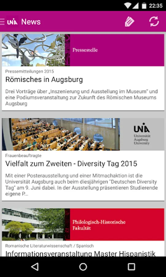 News feature | Right after starting the app, the user receives all important news around the campus of the University of Augsburg. These are directly presented on the home screen and can be adjusted to personal interests.