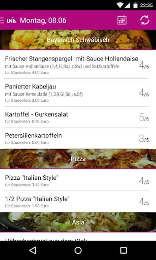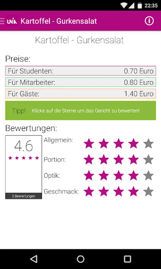 Menu of the canteen | The CampusApp provides the option to retrieve the current menu of the canteen of the University of Augsburg directly on the smartphone. Here, a rating system allows the student to evaluate the individual dishes.