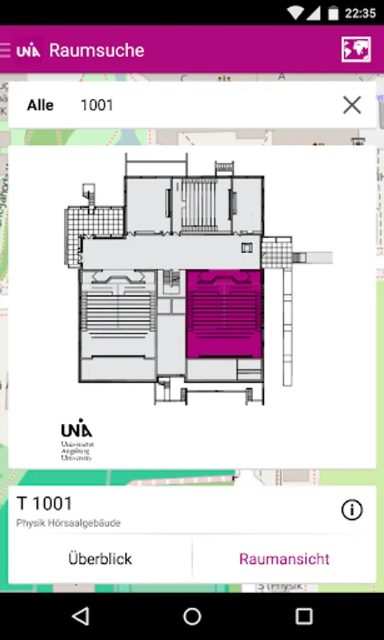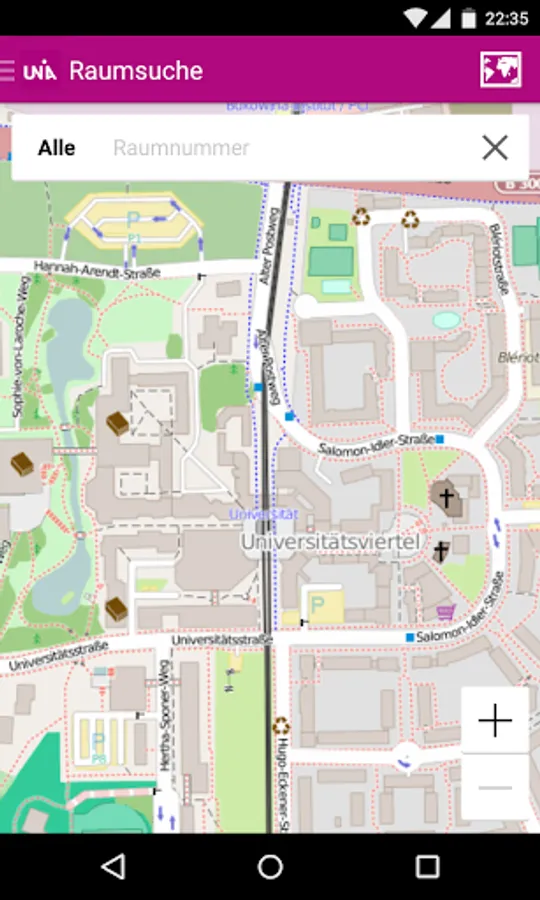 Search for rooms and buildings | For a better orientation on campus the CampusApp offers a building floor plan and a room search for all lecture halls and seminar rooms. With this feature a helpful navigation on campus is guaranteed.
