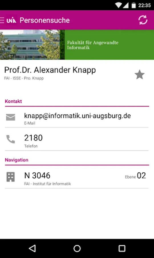 As a free application for smartphones the CampusApp was developed by a project group under the direction of the University of Augsburg. With useful features like a search for rooms or persons, a news feature or the menu of the canteen, the CampusApp supports both students and staff of the University of Augsburg. Also the CampusApp improves the public image of the modern Universität Augsburg. Those students, who are new the University of Augsburg, will benefit from the CampusApp in many ways. Since the first day on campus, the app will be a great assistant in their pocket.