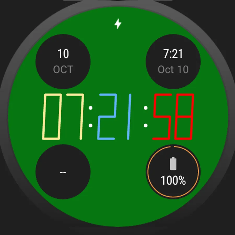 The colors of the background, hours, minutes and seconds and separators can be set via the configuration. Similarly, the 4 Complications.