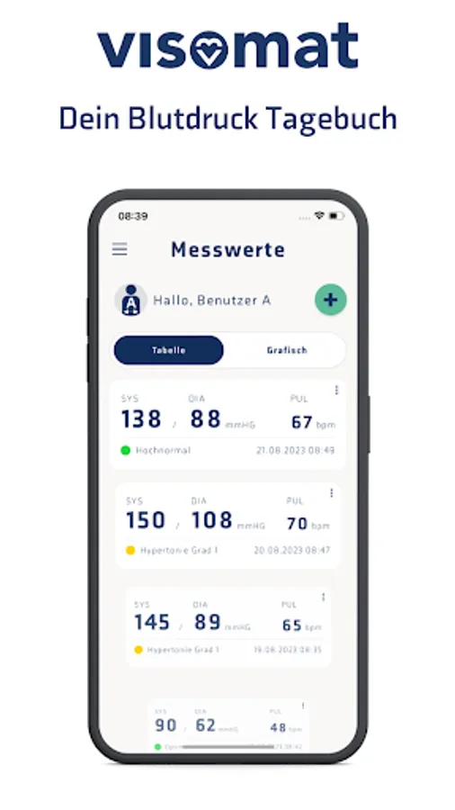 The visomat app is your companion for blood pressure monitoring and helps you keep an eye on your blood pressure.
