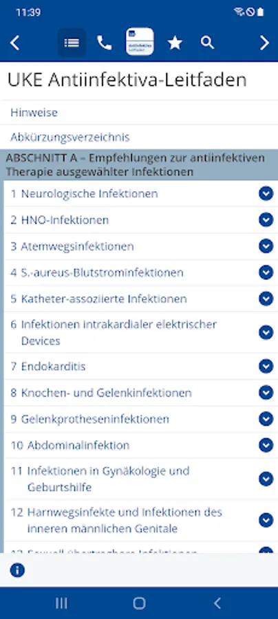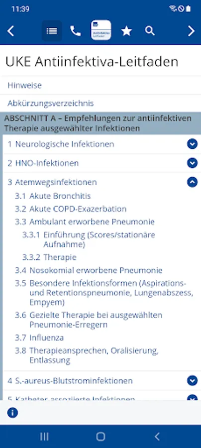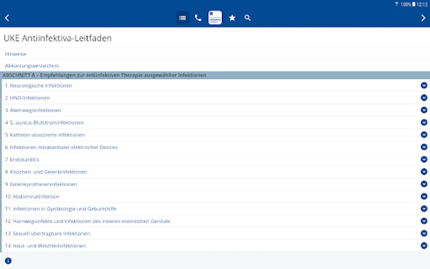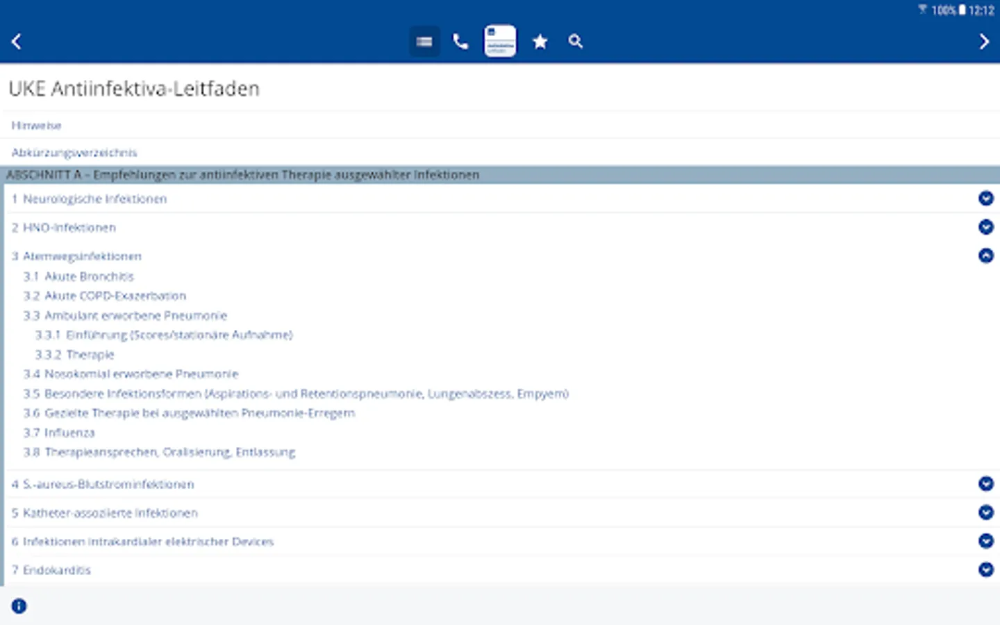 The anti-infective guidelines of the University Hospital Hamburg-Eppendorf (UKE) contain information on rational antimicrobial therapy and prophylaxis of infectious diseases. For each indication, recommendations for diagnostics, the most common pathogens and therapy with dosage and duration of therapy are given. Doses are generally for a normal-weight adult individual with normal kidney and liver function, dose adjustments are discussed in a separate section. The UKE should only deviate from the therapy recommended in the guidelines in justified individual cases.