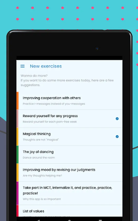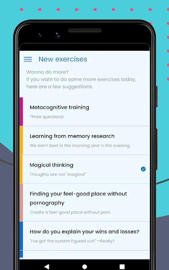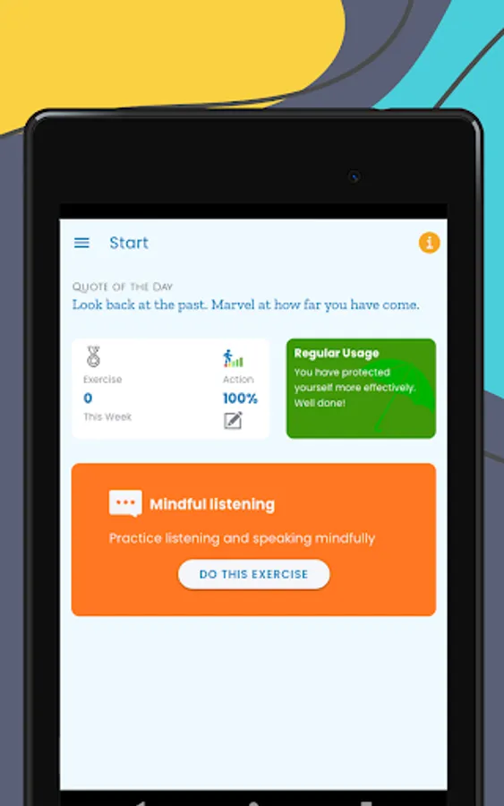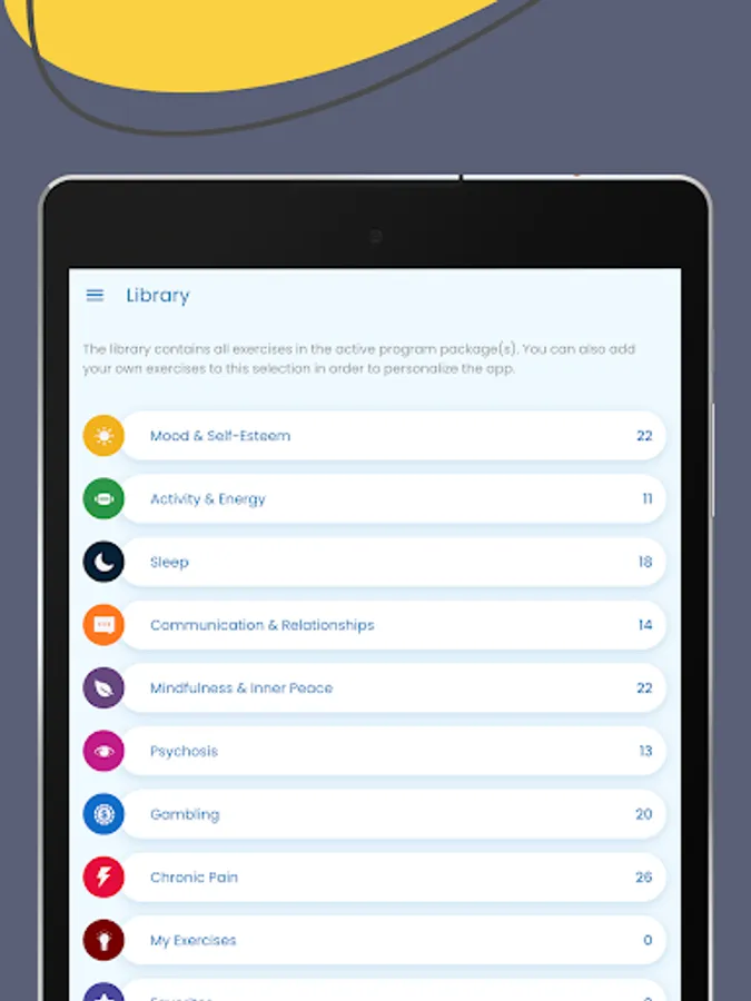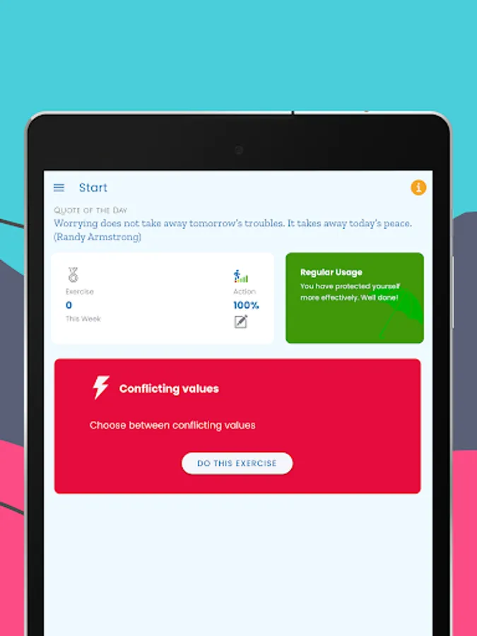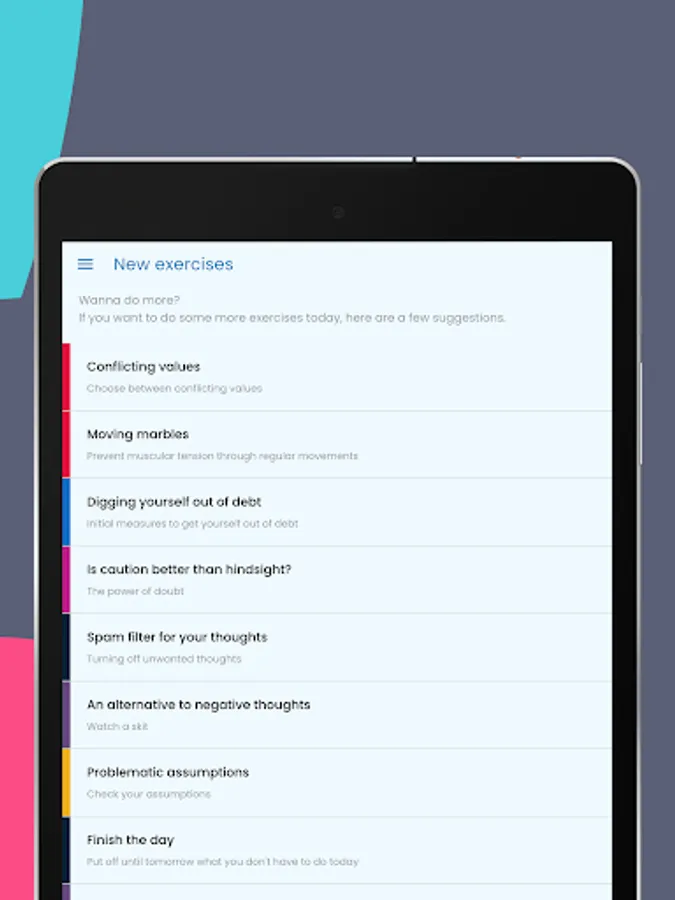 Taking care of your mental well-being is a bit like brushing your teeth: you have to do the exercises regularly so that they become routine and change your mood. Therefore, the app tries to support you in carrying out the self-help exercises as regularly as possible so that they become second nature and change your mental state. Reading about and understanding a problem are helpful but not sufficient and usually do not lead to any lasting changes. You will benefit the most from the app if you actively participate and practice continuously! The exercises are repeated over time. This is good! Only through regular repetition is it possible to overcome difficulties permanently.