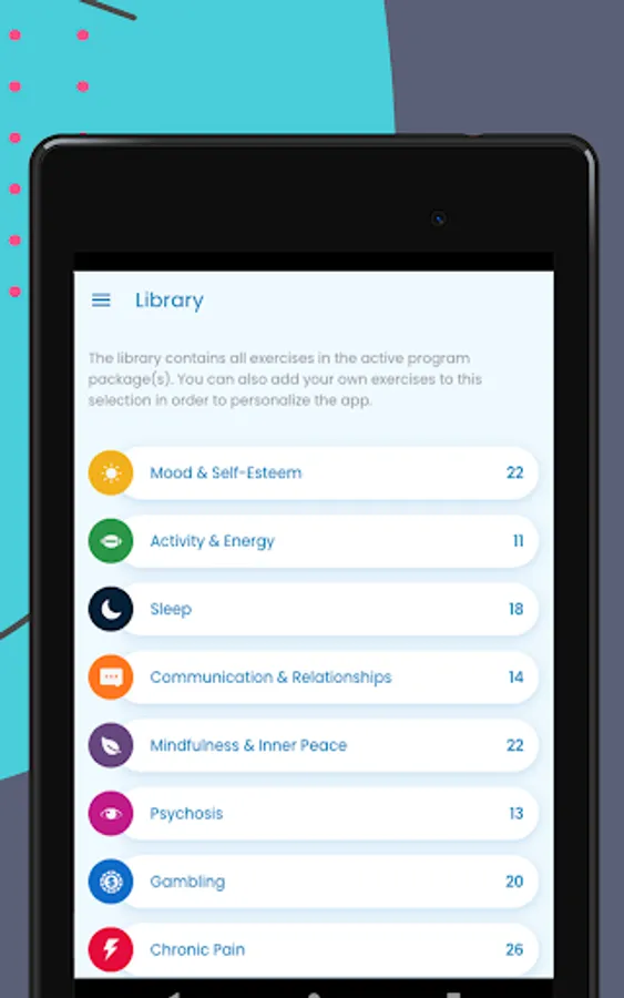 You can select different program packages depending on the issues you want to work on. For example, one of the program packages is specifically designed for people with a gambling problem. Another program package is intended for people who have psychotic experiences (ideally, this program package should be used along with Metacognitive Training for Psychosis (MCT), available at no cost from uke.de/mct. The app is not meant as a substitute for psychotherapy.
