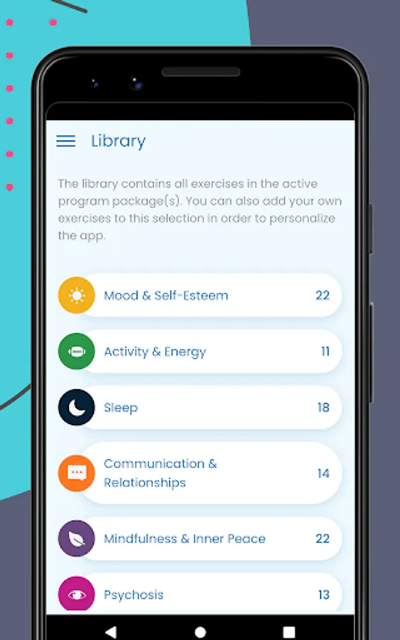 Scientific studies confirm the effectiveness of the app on emotional problems and self-esteem (Lüdtke et al., 2018, Psychiatry Research; Bruhns et al., 2021, JMIR). The self-help exercises used in the app are based on scientifically recognized techniques of cognitive behavior therapy (CBT) as well as Metacognitive Training (MCT) that reduce emotional problems such as sadness and loneliness and also improve problems with impulse control. Each day, you will receive new exercises. The exercises take just a few minutes and can easily be integrated into your everyday life. Up to two push messages will remind you to do the exercises regularly (optional feature). You will also be able to write your own exercises or to modify existing exercises. So, you can turn the app into your personal “guardian angel.” However, the app does not automatically adapt to the user's behavior (a learning algorithm has not been included).