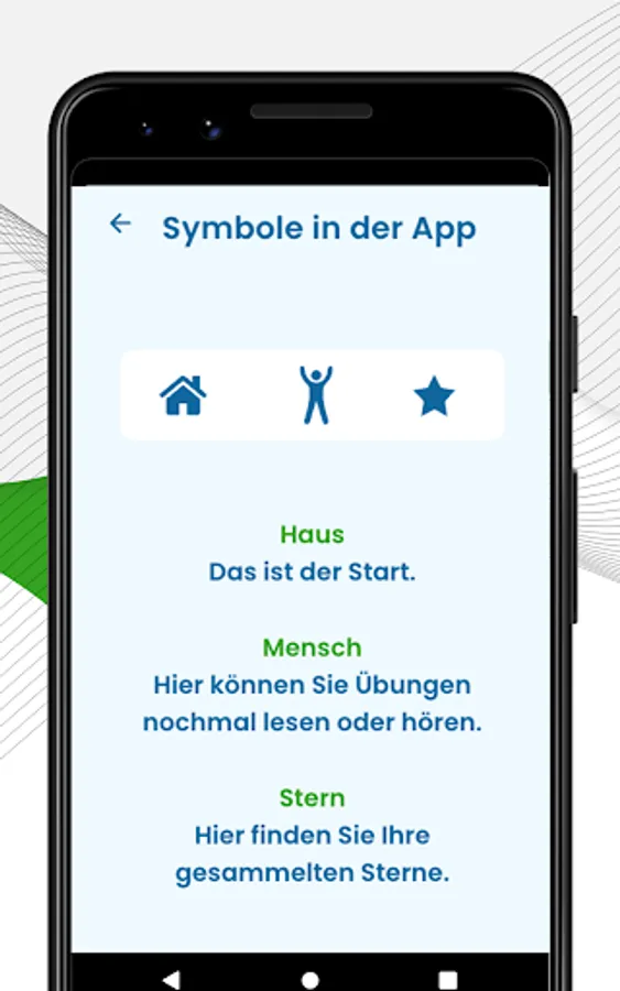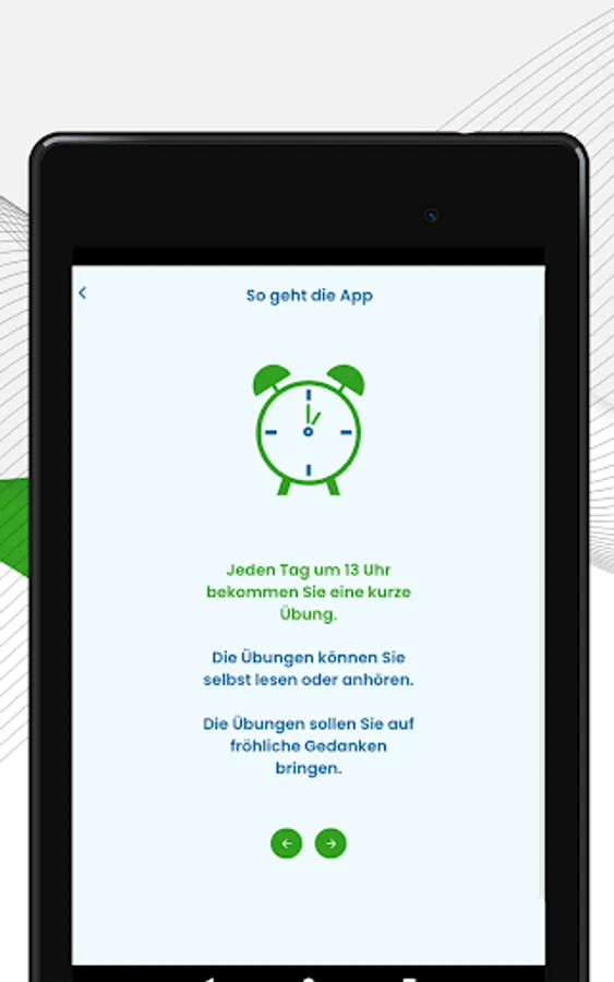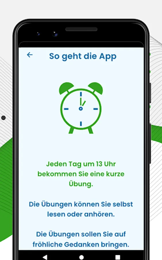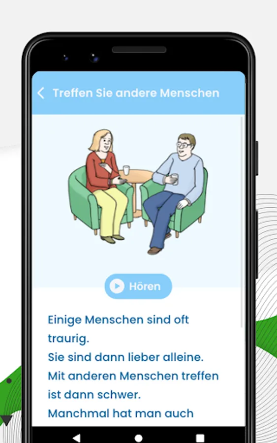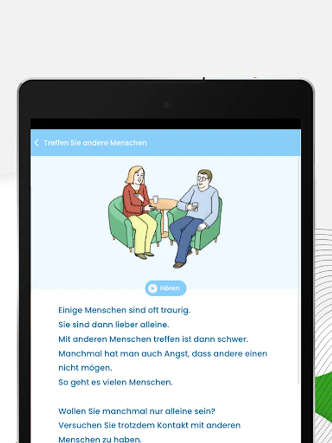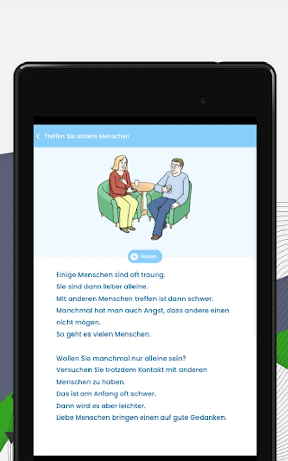 The Happy App is based on the COGITO App (www.uke.de/cogito) and is aimed at people with learning disabilities. It contains short exercises in plain language. The exercises should bring you to happy thoughts. Every day you get a new exercise. Using the app is easy, free and anonymous. The Happy App is constantly being further developed by Lebenshilfe Hamburg e.V. and the Clinical Neuropsychology working group at the University Medical Center Hamburg Eppendorf (UKE).