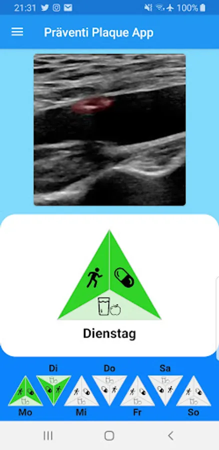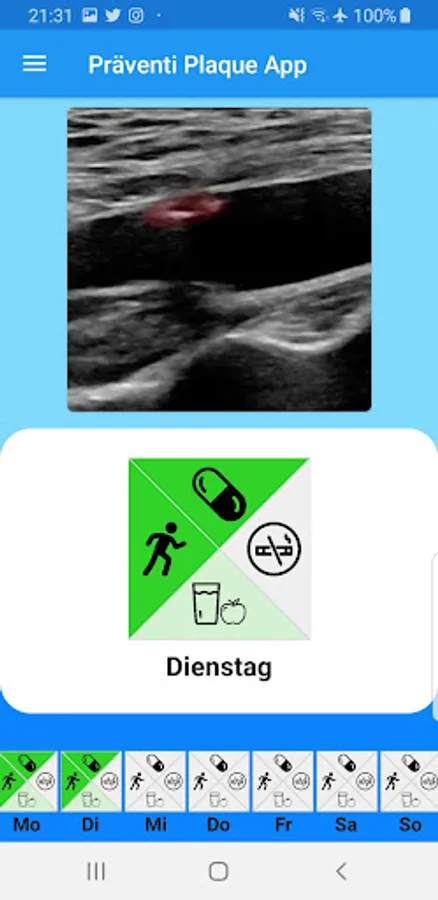 The app is used as part of a clinical randomized study in the field of cardiology and angiology at the University Hospital Essen. The app links the visual display of your own carotid plaque findings (ultrasound image) and the medically recorded data on cholesterol, blood pressure and weight with the most important target areas for improving a healthy lifestyle, such as exercise, drinking / eating, taking medication and smoking. The app is intended to help patients in a simple way to lead a healthy lifestyle and to implement the recommendations of their treating physicians in a sustainable manner in everyday life.