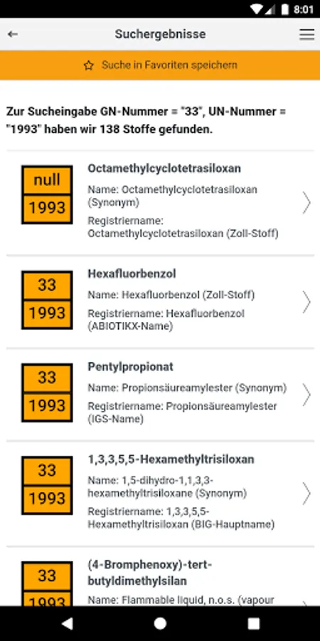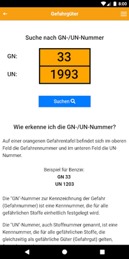 Various search interfaces can be used to search for certain chemicals using sum formulas, E numbers or substance names, among other things. You can also find out what information is hidden behind the orange warning sign. These warning signs can be found on trucks that transport heating oil, for example. The app is also equipped with a barcode scanner that can be used to scan the EAN codes of products. This means that the ingredients are displayed directly in the app. No complicated chemical names have to be entered, but can be selected directly from the ingredient list to call up more detailed information.